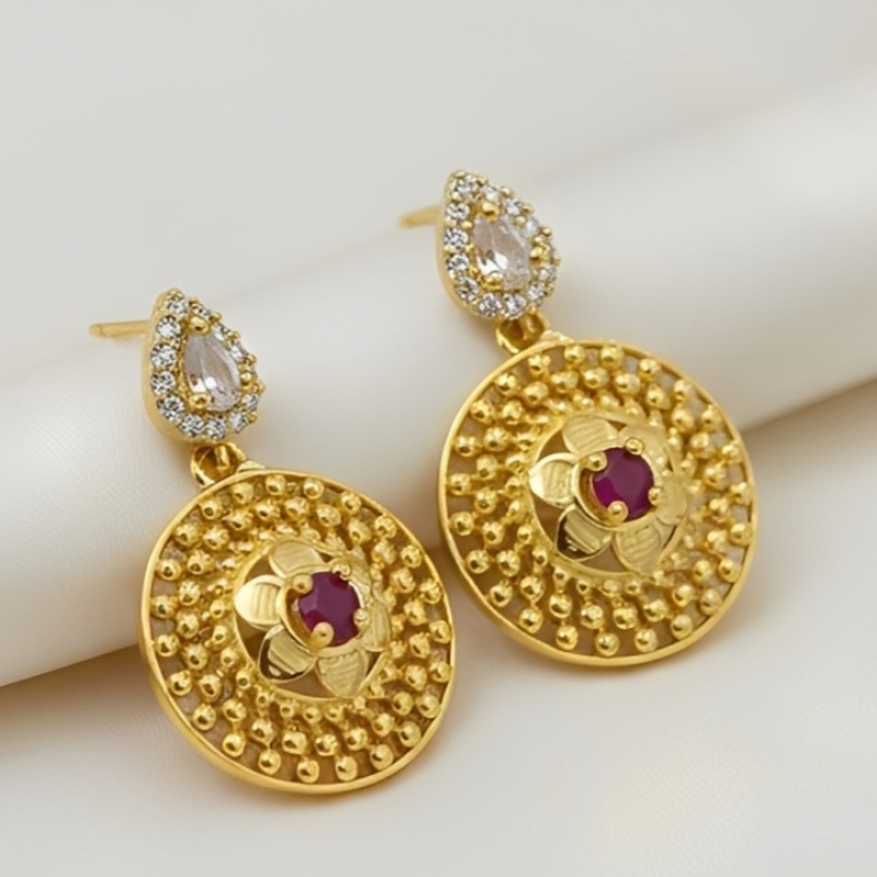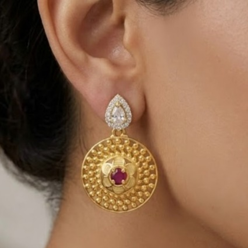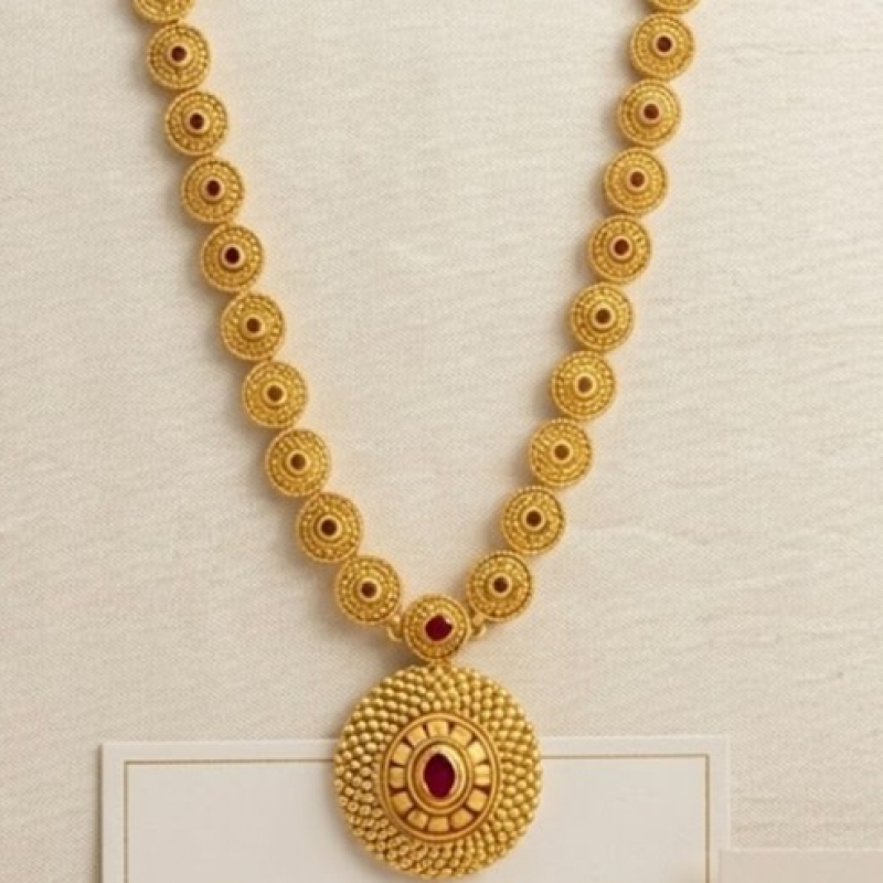 Beautiful Gold-Polished Long Necklace Set with Matching Earrings, crafted to give a rich traditional look. The necklace features elegant circular motifs and a stunning pendant with red stone detailing that adds a royal touch. Perfect for weddings, festivals, and special occasions, this long necklace set enhances both ethnic and modern outfits with its graceful design.