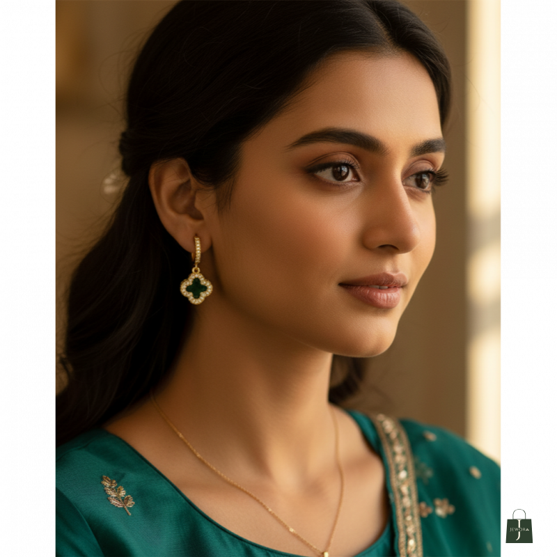 Elevate your jewellery collection with these stunning 14K gold plated drop earrings featuring an exquisite clover-shaped design. The centrepiece showcases a vibrant green crystal, beautifully framed by a sparkling cubic zirconia halo that adds a touch of glamour to every outfit. These elegant earrings combine timeless style with contemporary charm, making them perfect for both everyday wear and special occasions. The secure lever-back closure ensures comfortable, worry-free wear, while the premium gold plating offers a luxurious finish. The intricate detailing and harmonious blend of green crystal with clear cubic zirconia creates a captivating play of light that draws attention to your face. These versatile earrings complement both traditional and modern ensembles, making them an essential addition to any fashion-forward wardrobe. Their modest size strikes the perfect balance between statement-making and sophisticated subtlety.