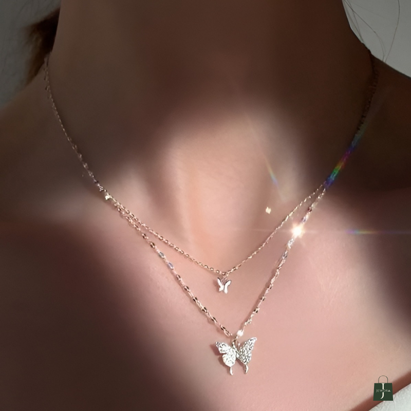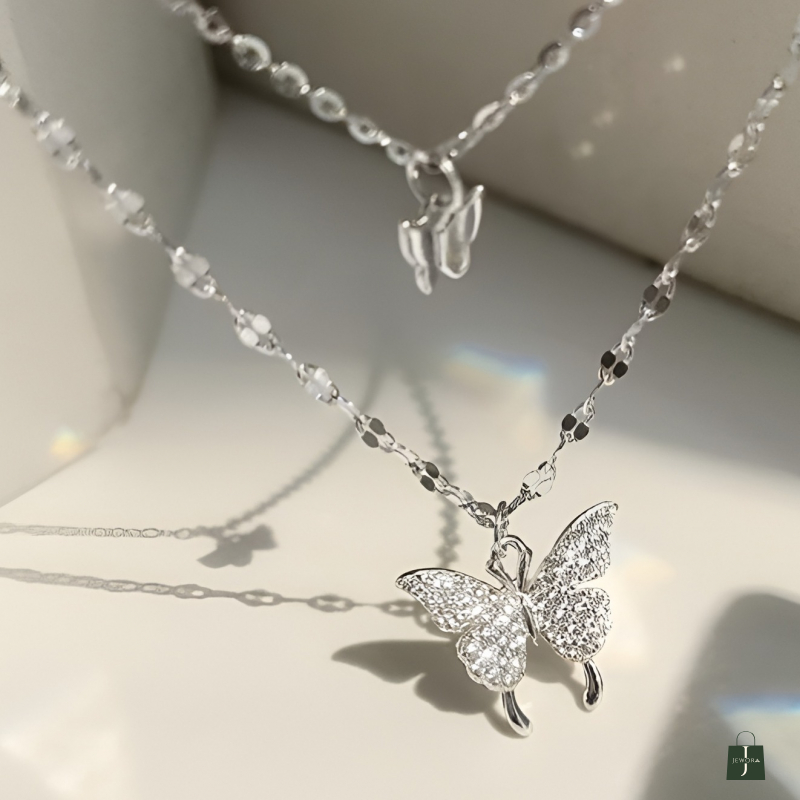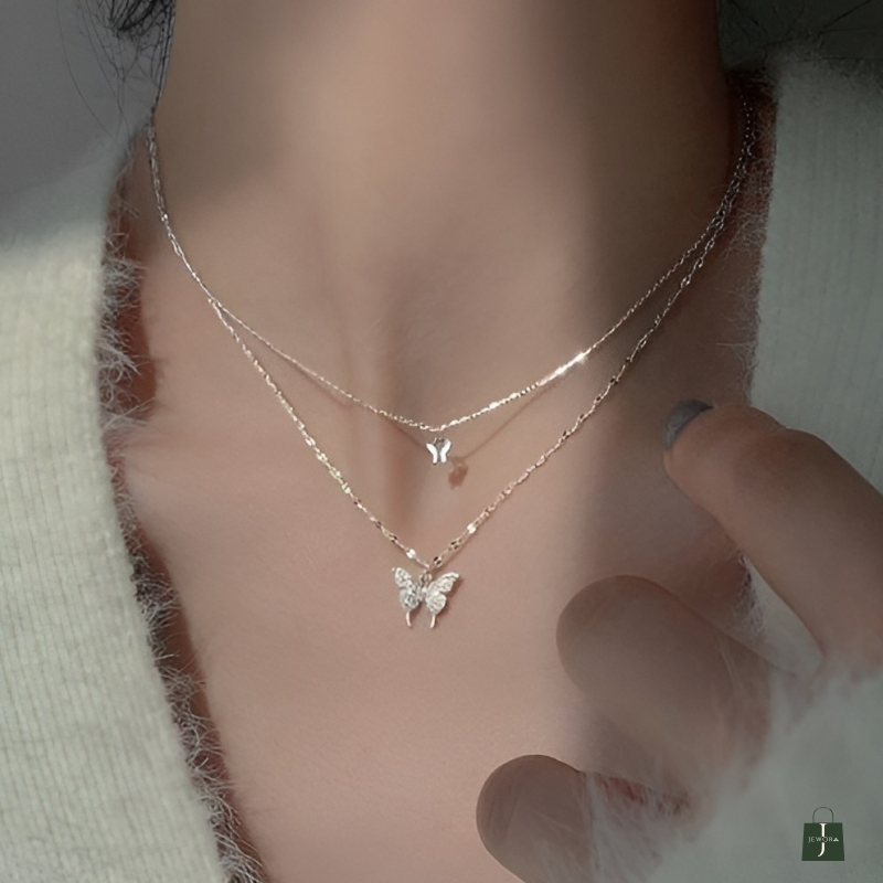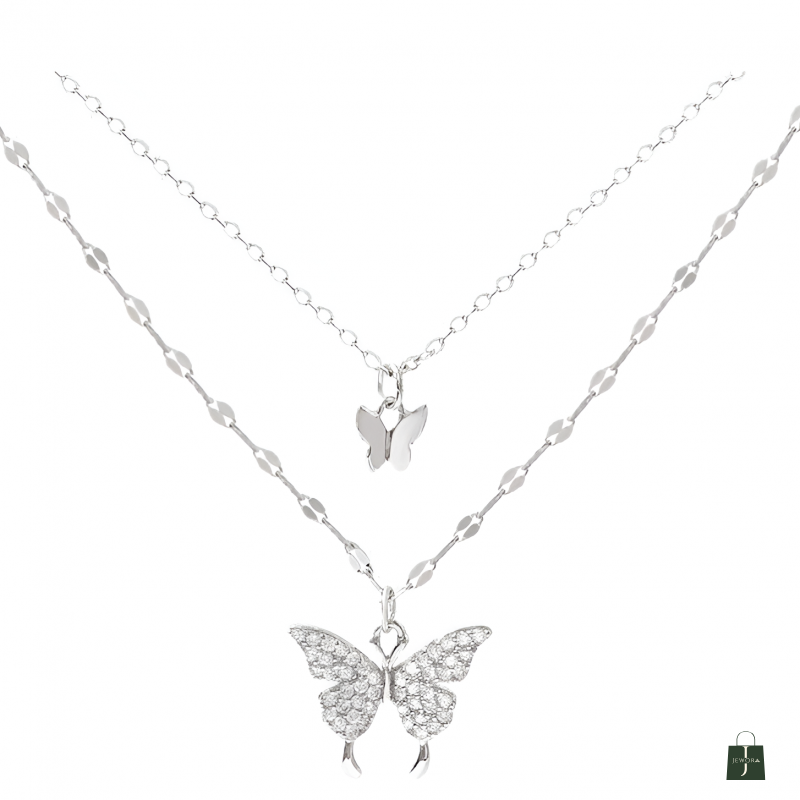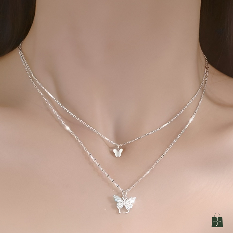 Elevate your everyday style with this elegant Silvia 925 Sterling Silver Double Layer Butterfly Necklace, crafted for women who love minimal yet sparkling jewellery. Made from pure 925 sterling silver, this necklace features a dual-layer chain with two beautiful butterfly charms — a small polished butterfly and a larger crystal-studded butterfly pendant for added shine.