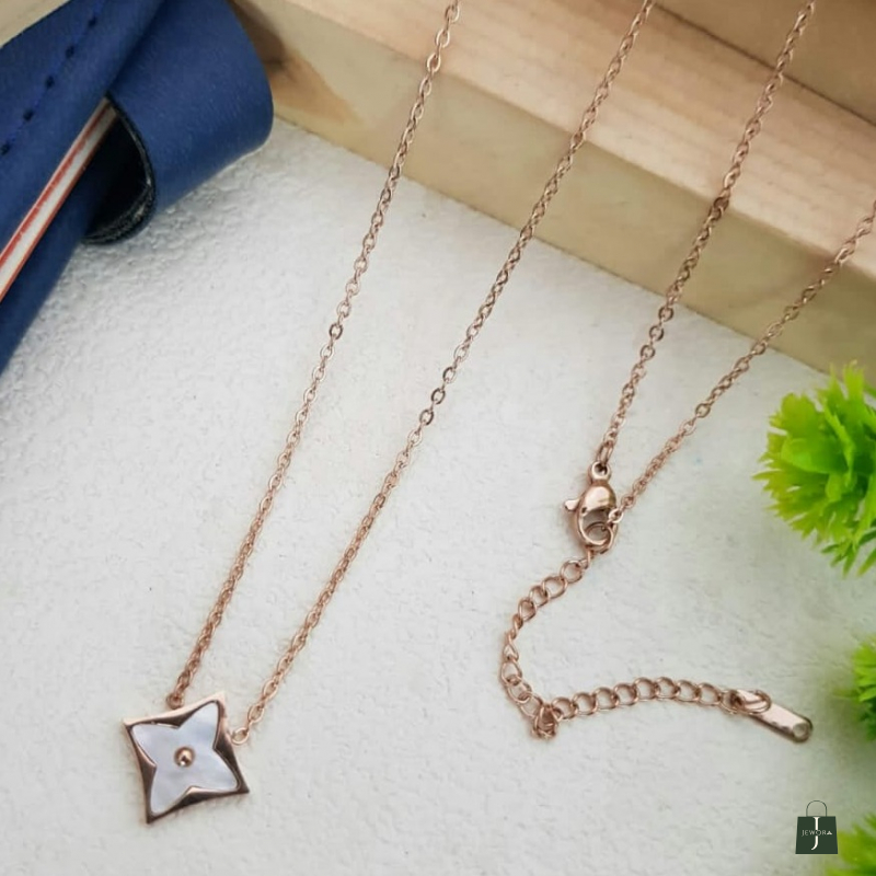 The Rose Gold Mother-of-Pearl Star Pendant Necklace features a modern star-shaped pendant with a glossy white mother-of-pearl inlay at the center, framed in a warm rose gold tone. Its clean lines and minimal silhouette make it a perfect everyday accessory, while the subtle shine of the pearl adds a soft luxurious feel. This necklace is lightweight, stylish, and ideal for casual wear, office outfits, or gifting.