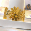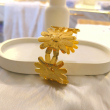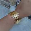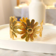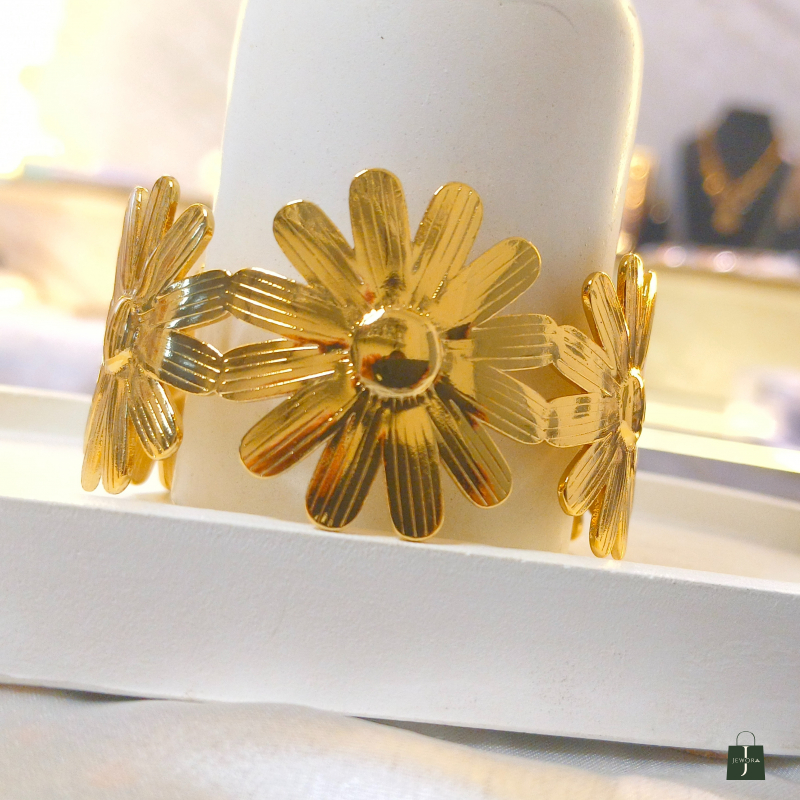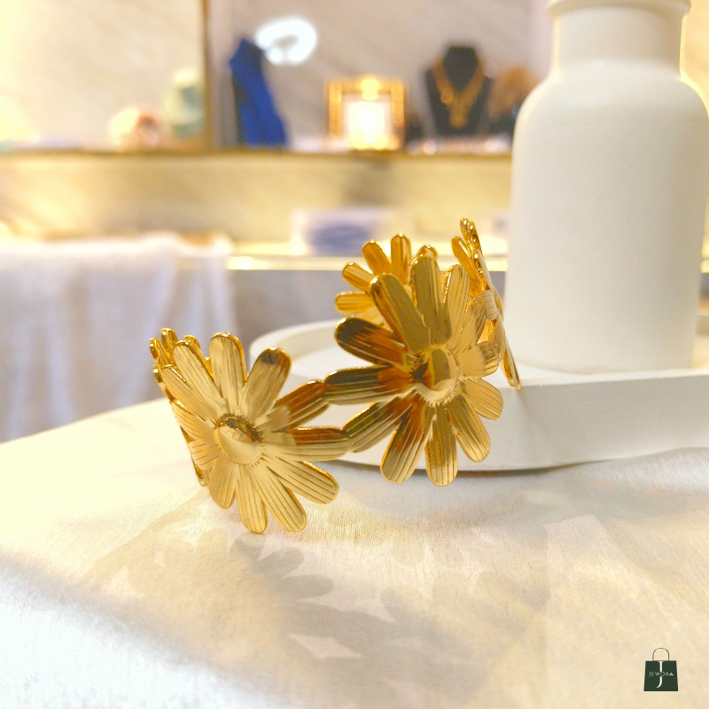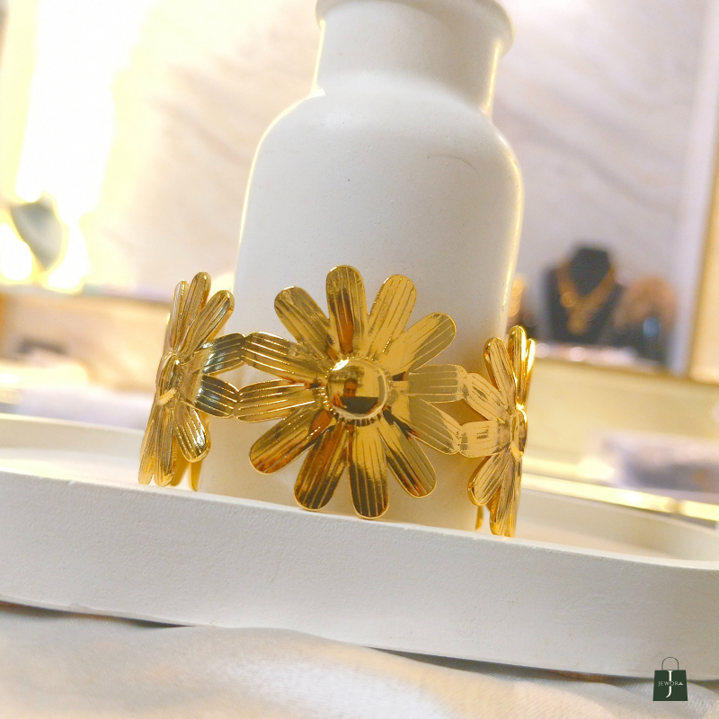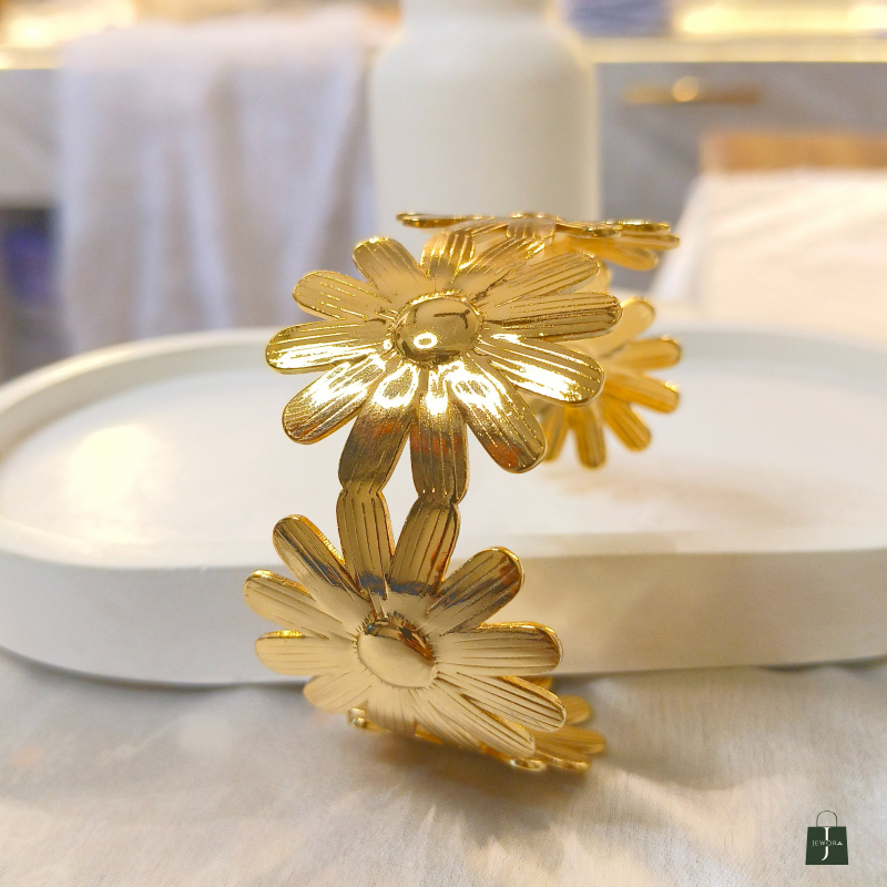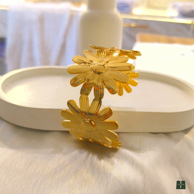 The Golden Bloom Floral Cuff Bracelet is a charming and feminine statement piece crafted with beautifully detailed flower motifs in a rich gold finish. Featuring three blooming daisy-style flowers connected in a sleek cuff design, this bracelet brings a fresh, nature-inspired elegance to your look. Its textured petals reflect light gracefully, giving it a premium and polished appearance. Perfect for daily wear, brunch dates, vacations, or gifting, this bracelet adds a soft yet luxurious touch to both western and fusion outfits.