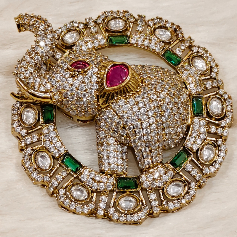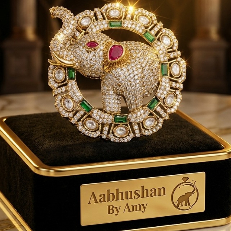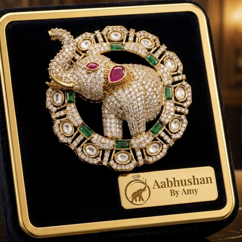 An iconic creation from Aabhushan By Amy, this brooch celebrates the grandeur of the elephant—symbolizing wisdom and royalty. Its exquisite design and radiant stones make it a timeless heirloom piece.