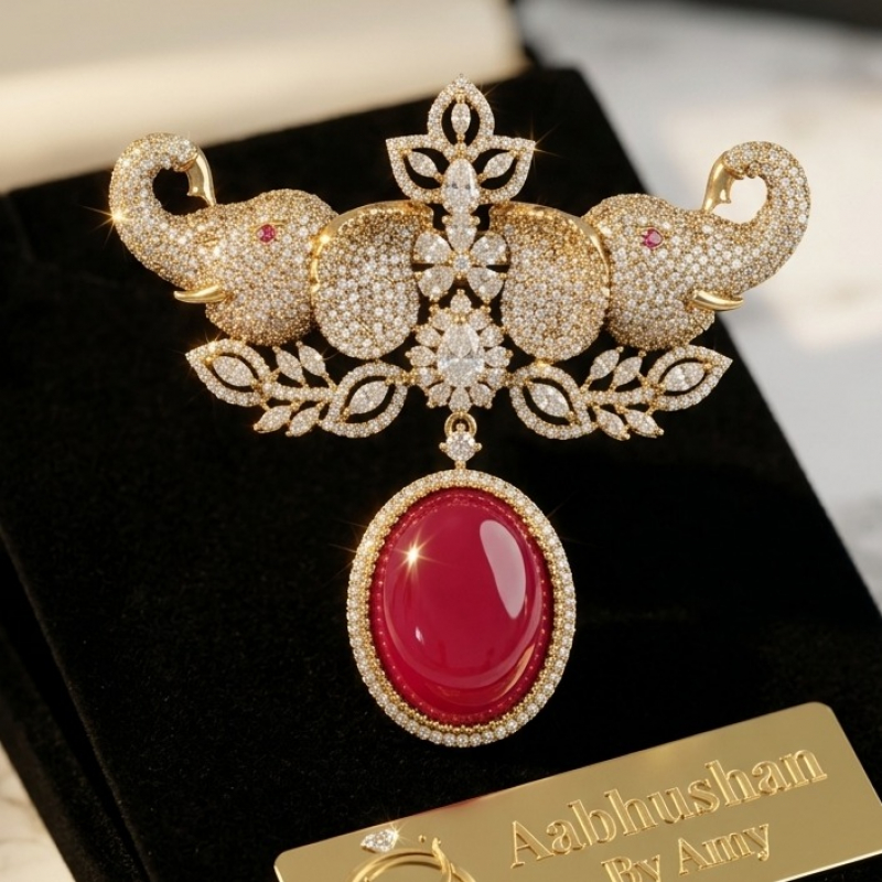 An iconic design from Aabhushan By Amy, this brooch symbolizes harmony and royal grace. With its intricate detailing and luminous centerpiece, it is crafted for those who appreciate timeless luxury.