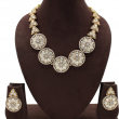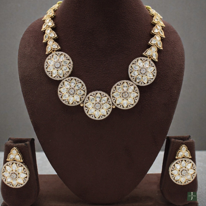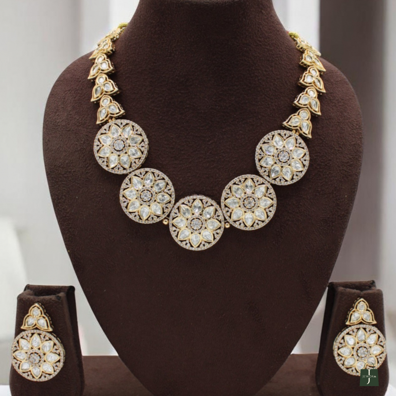 Grace your special occasions with this stunning floral Polki statement necklace set. Designed with beautifully crafted circular floral motifs, each disc is adorned with pear-shaped Polki stones arranged in a radiant flower pattern. The antique gold finish enhances its regal charm, giving it a timeless heritage appeal.