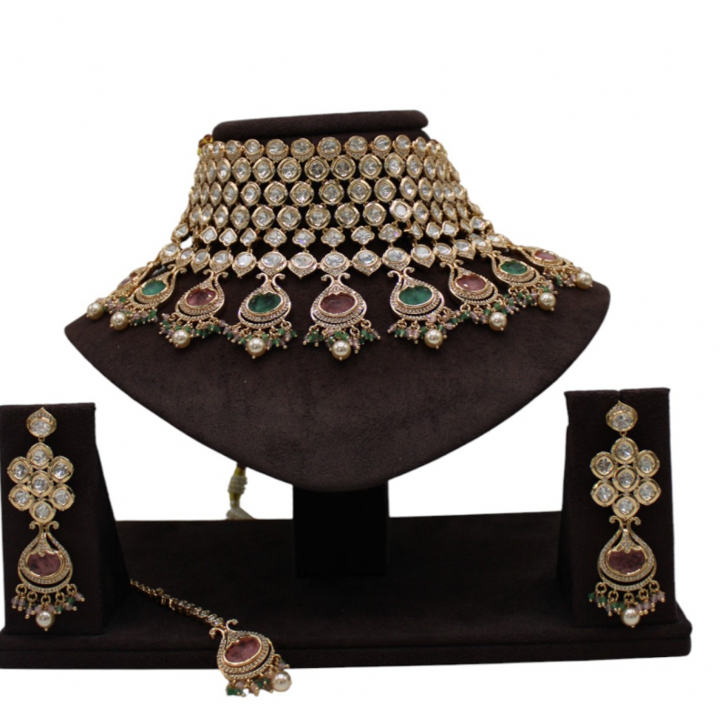 The set comes with matching long statement earrings and a coordinating maang tikka, making it a complete bridal ensemble. Perfect for weddings, receptions, and grand festive occasions, this piece beautifully complements lehengas, sarees, and traditional outfits.