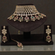 Make a royal statement with this exquisite Kundan bridal choker set crafted in rich antique gold polish. The choker features multiple rows of sparkling white Kundan stones arranged in a luxurious layered pattern. The lower border is adorned with intricately carved paisley motifs highlighted with emerald green and deep ruby stones, finished with delicate pearl and green bead drops for graceful movement.