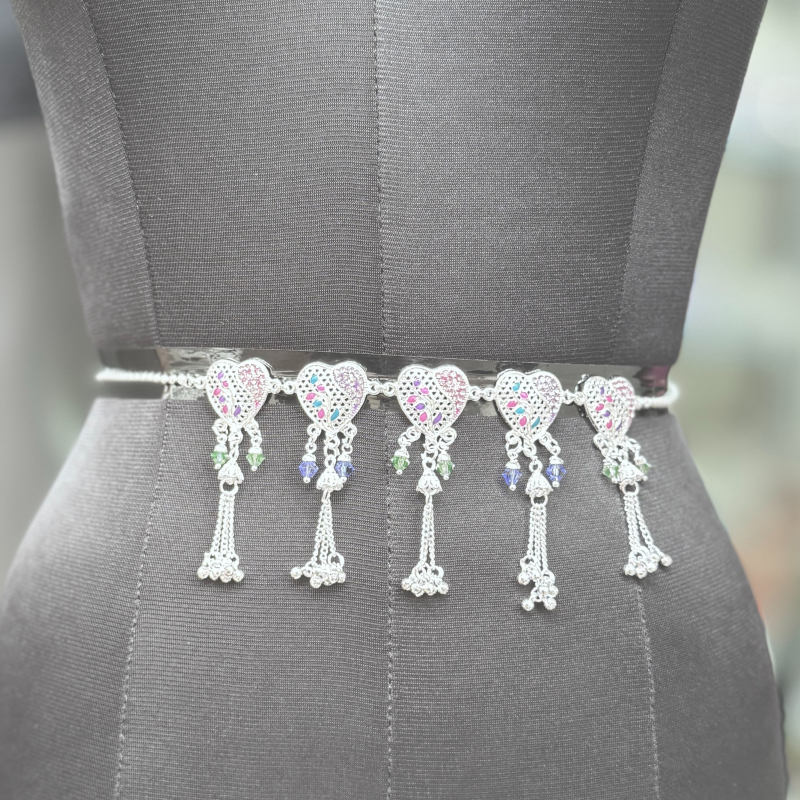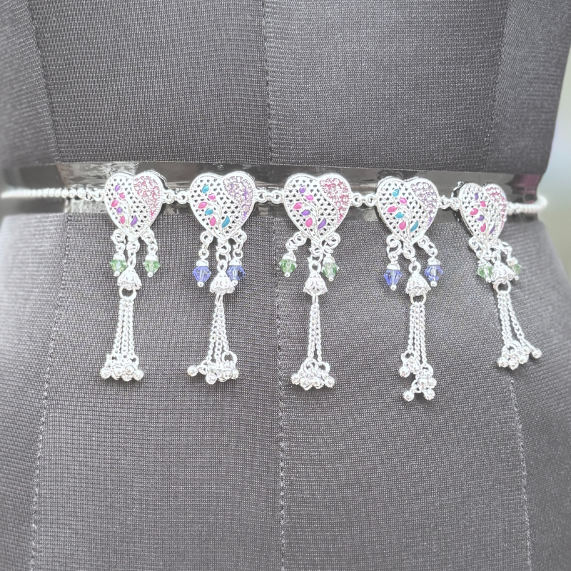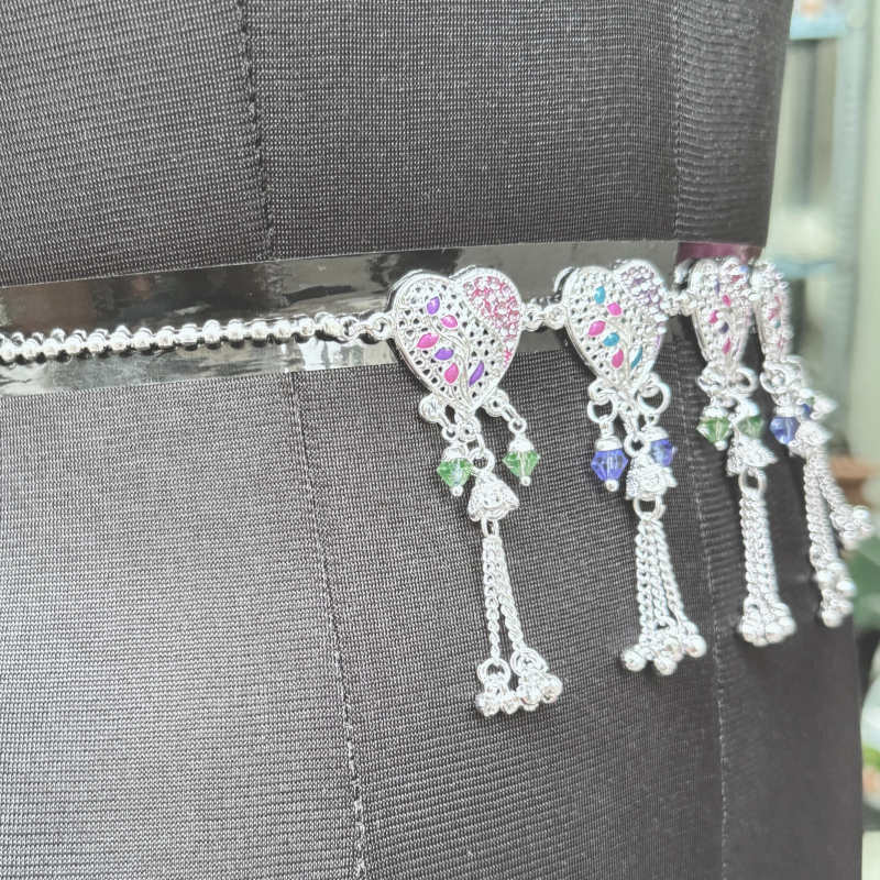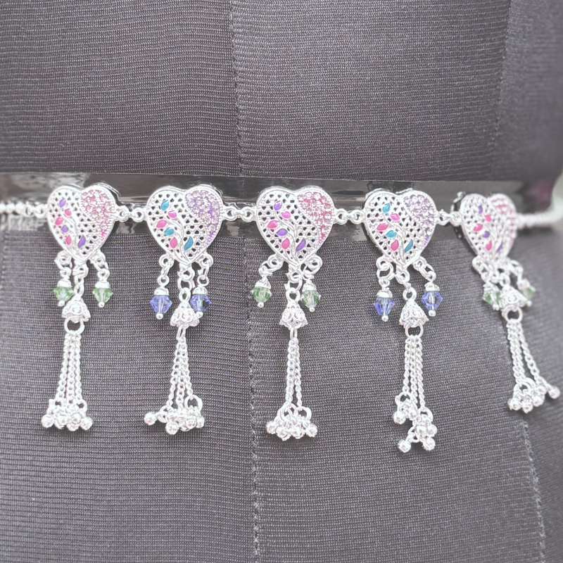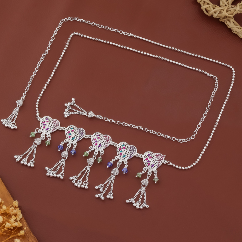 This charming silver-tone necklace showcases a row of beautifully detailed heart-shaped motifs decorated with vibrant multicolor enamel accents. Each motif is adorned with delicate bead drops in soft green and blue tones, complemented by elegant tassel chains that add graceful movement to the design. The dual-chain style enhances its modern ethnic appeal while ensuring a comfortable fit. Lightweight and stylish, this necklace is perfect for festive occasions, casual ethnic outfits, and traditional gatherings.