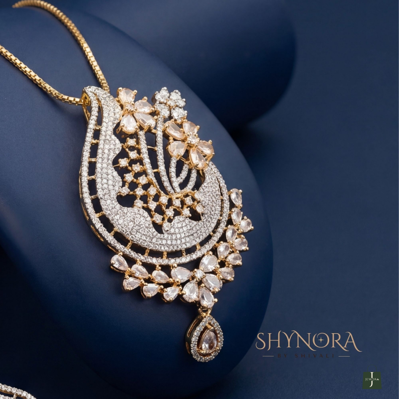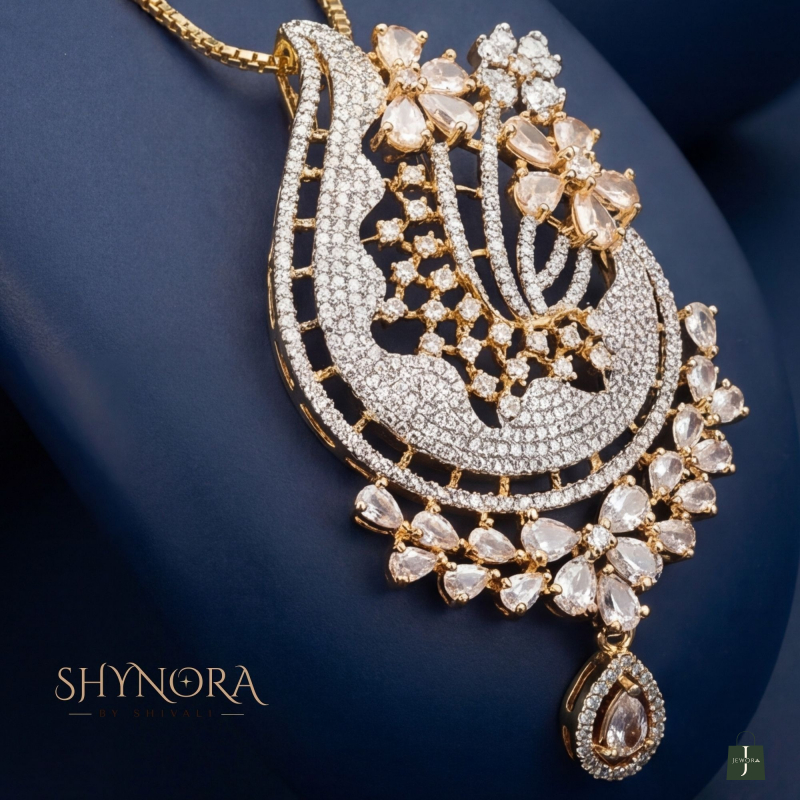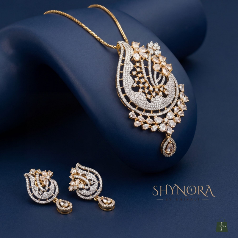 he Aarohi Paisley Glow Pendant Set showcases timeless Indian artistry with a modern sparkle. Designed in a graceful paisley (mango) silhouette, this set is adorned with shimmering American diamonds and delicate petal-cut crystal accents, finished in a rich gold-tone polish.