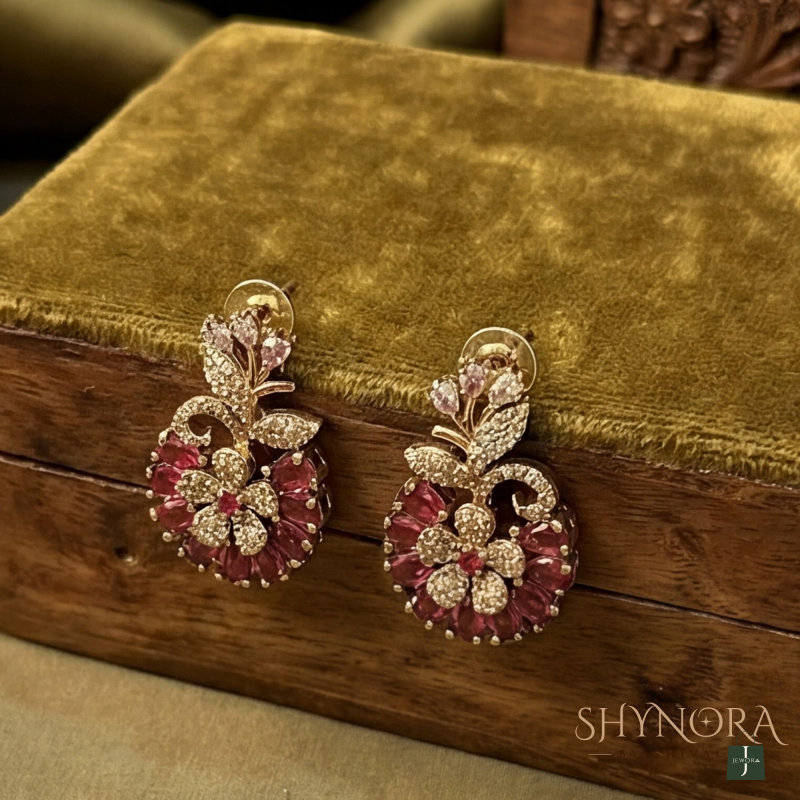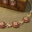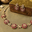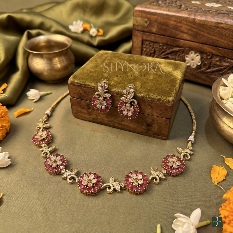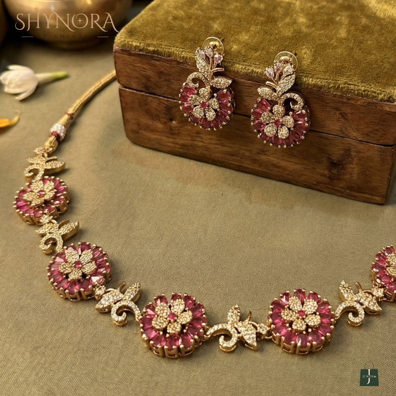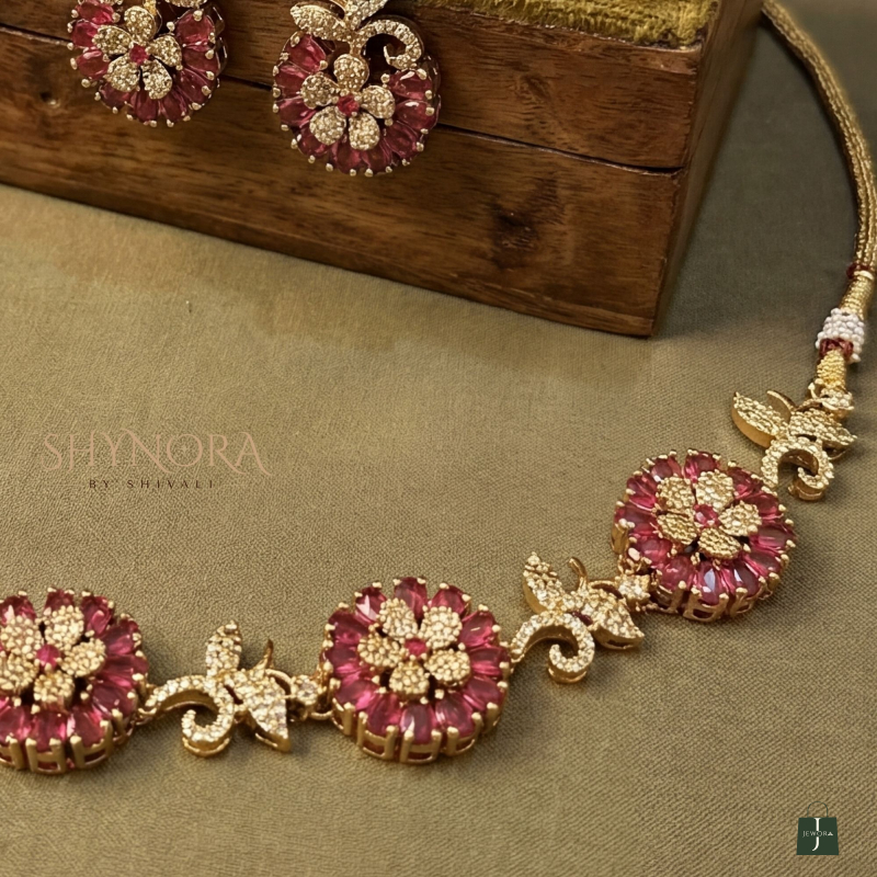 The Aarohi Red Floral Radiance AD Necklace Set features intricately designed round floral motifs embellished with deep red stones, beautifully highlighted with sparkling American Diamonds and finished in an elegant gold tone. The delicate leaf-inspired accents between each floral element add a graceful traditional charm.