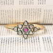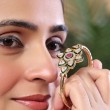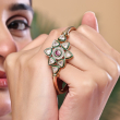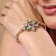 Bring timeless elegance to your jewellery collection with this beautifully crafted floral kundan open kada. Designed with a radiant flower motif, it features a rich ruby-colored center stone encircled by sparkling kundan petals highlighted with green enamel detailing. The sleek gold-toned band adds a modern touch while maintaining traditional charm. Lightweight and easy to wear, this bracelet is perfect for both festive occasions and everyday ethnic styling.