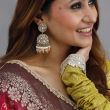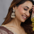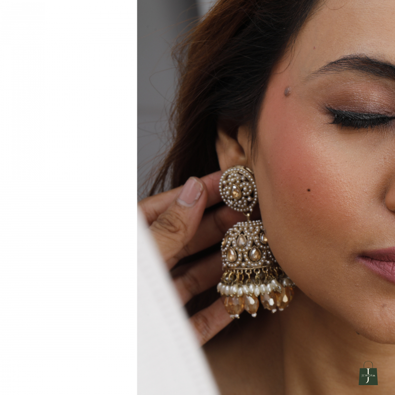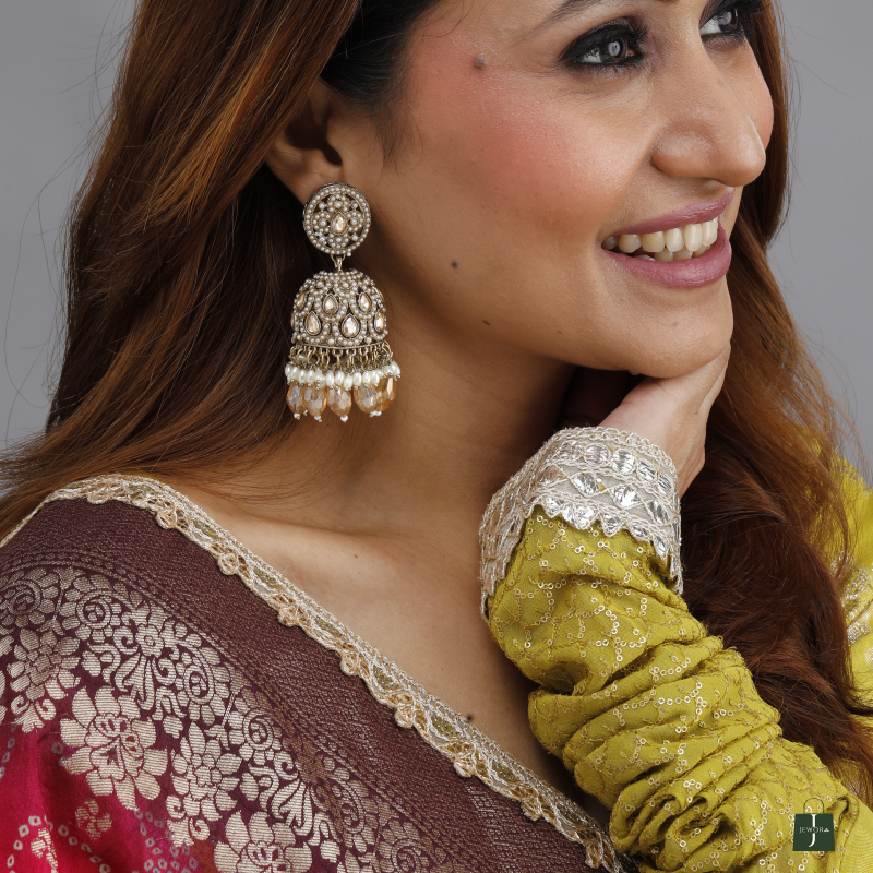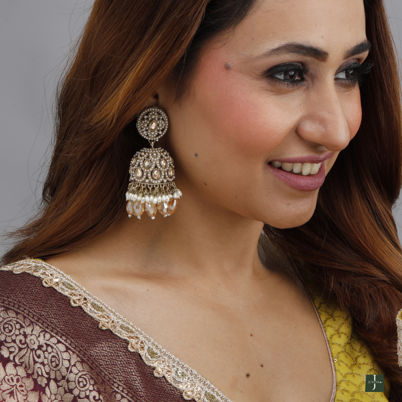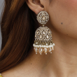 Enhance your ethnic ensemble with these exquisite pearl and Kundan Jhumka earrings, perfect for weddings, festivals, and special events. Showcasing an antique gold finish, these intricately designed earrings are adorned with shimmering Kundan stones and delicate pearl drops, adding a regal touch to your look.