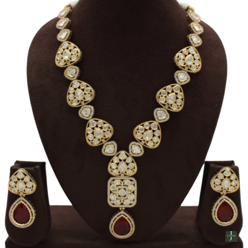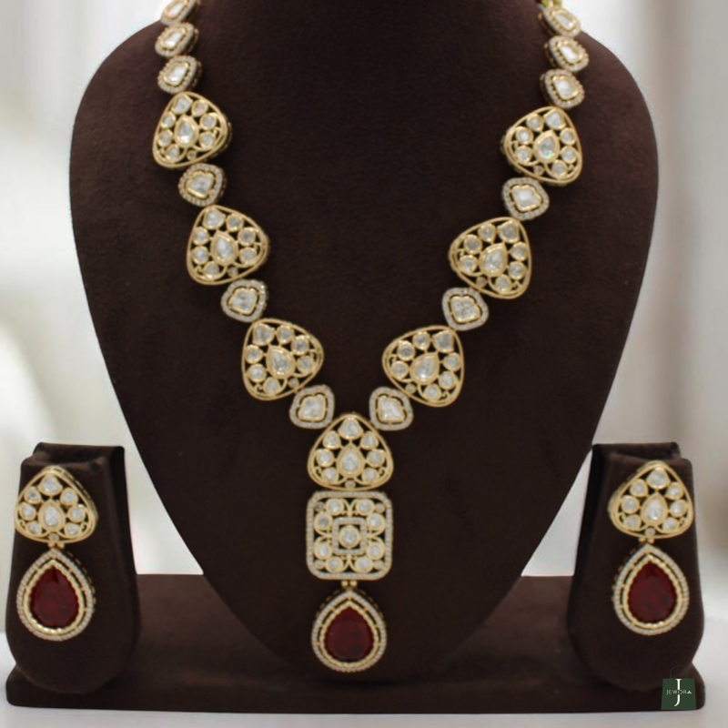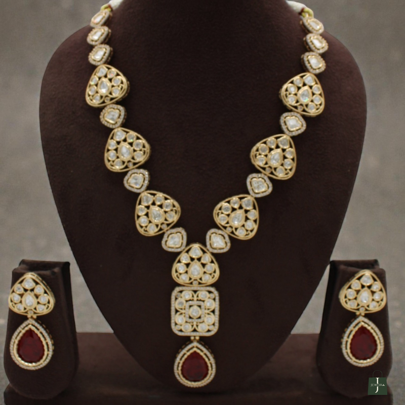 Make a graceful statement with this beautifully designed heart-motif Polki necklace set. Crafted in an elegant antique gold finish, the necklace features alternating heart-shaped and geometric Polki settings that create a rich, royal appeal. The highlight of the set is the deep ruby-red teardrop stone pendant that adds a bold and luxurious contrast.