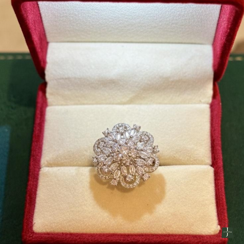 Design: Intricate multi-layered floral bloom with a central brilliant-cut focal point.