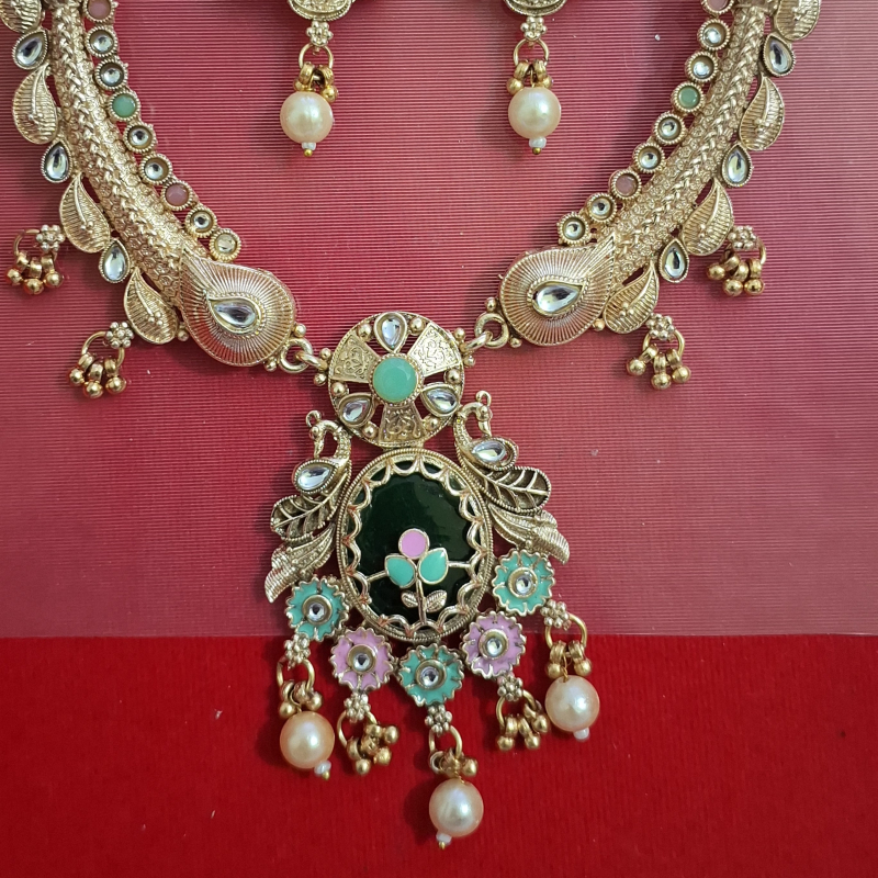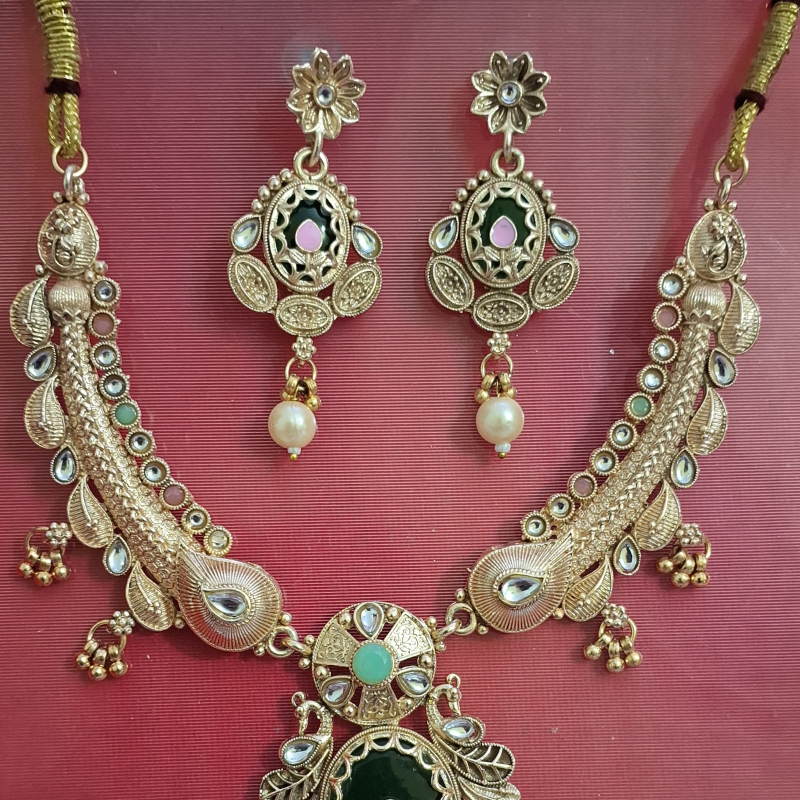 Elevate your festive and bridal look with this exquisite 3-piece jewellery set from Agrawal Jewels, featuring a stunning necklace and matching drop earrings in a lustrous golden high-polish finish. The intricately crafted necklace showcases princess cut simulated emerald green centrepiece stones, each beautifully framed in a sparkling halo of clear white crystals, totalling approximately 50 stones across the set. The matching drop earrings mirror the necklace's opulent peacock-inspired design, making this a perfectly coordinated ensemble. The necklace measures 45 centimetres in length and is secured with a lobster claw clasp, whilst the earrings measure 3.5 centimetres and feature a push-back friction fitting for comfortable all-day wear. Ideal for weddings, engagements, anniversaries, birthdays, and formal occasions, this set pairs beautifully with a saree, lehenga, or traditional attire. Makes a thoughtful and elegant gift for the special women in your life.