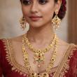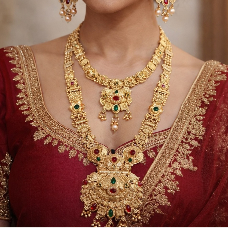 Elevate your bridal or festive look with this exquisite 3-piece jewellery set from Agrawal Jewels, featuring a stunning necklace and matching drop earrings in a lustrous golden high-polish finish. The intricately crafted necklace showcases princess cut simulated emerald green centrepiece stones, each beautifully framed in a sparkling halo of clear white crystals, totalling approximately 50 stones across the set. The matching drop earrings mirror the necklace's opulent peacock-inspired design, creating a perfectly coordinated ensemble. The necklace measures 45 centimetres in length and is secured with a lobster claw clasp, whilst the earrings measure 3.5 centimetres and feature a push-back friction fitting for comfortable all-day wear. Ideal for weddings, engagements, anniversaries, birthdays, and formal occasions, this set pairs beautifully with a saree, lehenga, or any traditional attire. Makes a thoughtful and elegant gift for the special women in your life.