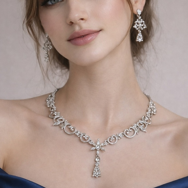 Elevate your look with the Agrawal Jewels Crystal Halo Jewellery Set, a stunning 3-piece ensemble crafted for brides and those who love making a bold statement. The necklace features an intricate feather-leaf motif adorned with deep ruby-toned simulated stones and sparkling white crystals in a graceful halo design, set in white gold-plated metal with a high-polish finish. The chain measures 45.72 cm in length and is secured with a reliable lobster claw clasp. Matching drop earrings mirror the necklace's elegance, with cascading ruby and crystal clusters suspended from push-back findings, measuring 3.5 cm in length. A coordinating ring completes this luxurious set. Featuring a halo setting and high-polish finish, this set is perfect for weddings, engagements, anniversaries, galas, and formal celebrations. It pairs beautifully with both traditional Indian attire and contemporary evening wear. The set includes 50 stones in total and weighs approximately 70 grams.