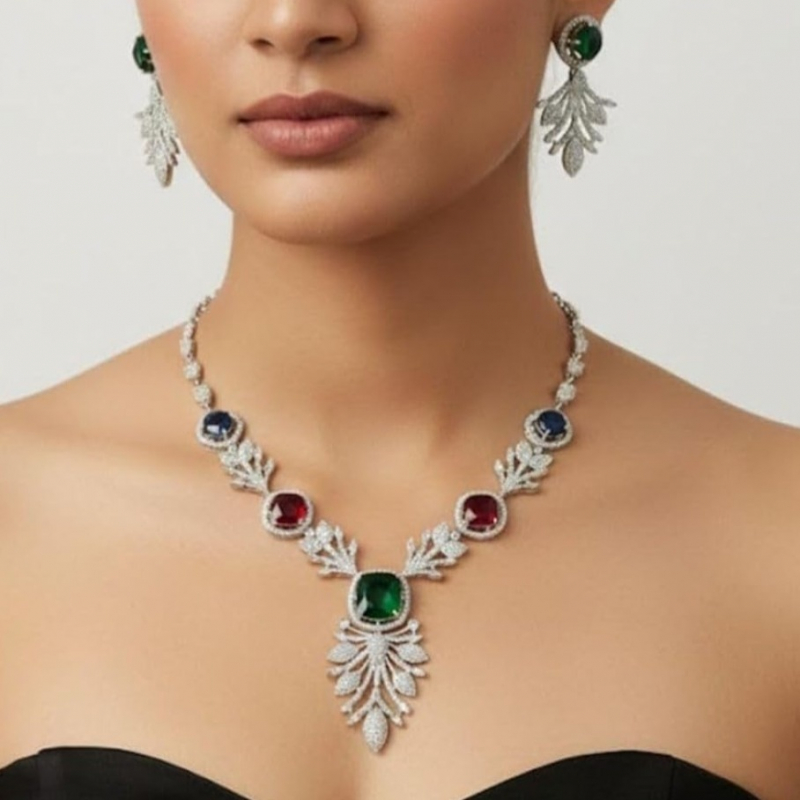 Elevate your look with this stunning 3-piece jewellery set featuring a statement tennis necklace and matching drop earrings. The necklace showcases a striking arrangement of cushion-cut simulated stones in rich emerald green, deep ruby red, and sapphire blue, each framed within an intricate halo of sparkling clear crystals set in an elegant feather-inspired design. The centrepiece pendant draws the eye with a bold emerald green stone surrounded by shimmering crystal detailing. Measuring 45 centimetres in length, the necklace fastens securely with a lobster claw clasp. The matching drop earrings mirror the necklace's design, featuring an emerald green stone atop cascading crystal-encrusted feather motifs, secured with a push-back friction fitting for comfortable all-day wear. Finished in a high-polish silver tone setting, this set is perfect for weddings, formal dinners, galas, and festive occasions. It also makes a thoughtful gift for anniversaries, birthdays, and engagements. Pair with an evening gown or a classic saree for a truly show-stopping ensemble.