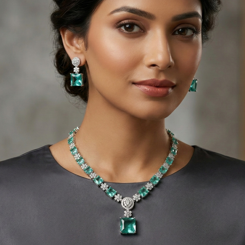 Elevate your style with the Agrawal Jewels Emerald Green Crystal Halo Necklace and Earrings Set, a breathtaking 3-piece jewellery collection designed for weddings, galas, anniversaries, and formal occasions. The elegant tennis necklace features princess-cut simulated emerald green stones set within a brilliant halo of sparkling clear white crystals, with a stunning drop pendant as the centrepiece. Measuring 45 centimetres in length, the necklace fastens securely with a lobster claw clasp for effortless wear. The matching drop earrings mirror the necklace's sophisticated design, each showcasing a square emerald green stone encircled by a dazzling crystal halo, with a push-back friction fitting for comfortable, all-day wear. Finished in a high-polish halo setting, this set features approximately 50 stones in total, radiating timeless luxury. Perfect for bridal, cocktail, and evening wear, it also makes a thoughtful gift for birthdays, engagements, and Valentine's Day. Pair with an evening gown or a classic saree for a truly show-stopping ensemble.