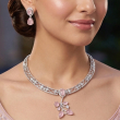 Elevate your look with this exquisite Pink Crystal Halo Jewellery Set, featuring a beautifully crafted necklace and matching drop earrings. The necklace showcases an intricate lattice-patterned band adorned with sparkling white crystals, leading to a graceful feather-leaf pendant set with soft pink oval and pear-shaped stones. The 45.72 cm chain is secured with a reliable lobster claw clasp for a comfortable fit. The matching drop earrings mirror the necklace's design, with a pink oval stone topped by a crystal halo and a delicate pear-drop, measuring 3.5 cm in length with push-back findings. Finished in high-polish white gold plating with rhodium-plated accents, the set weighs approximately 70 grams. Ideal for weddings, anniversaries, engagements, and formal celebrations, this jewellery set pairs beautifully with traditional Indian attire as well as contemporary evening wear, making it a perfect choice for brides and those seeking a regal, luxurious appeal. The set includes 1 necklace and a pair of drop earrings.