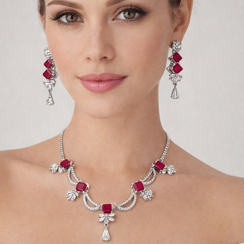 Elevate your look with the Agrawal Jewels Ruby Red Crystal Halo Necklace and Earrings Set, a stunning 3-piece jewellery collection crafted for weddings, anniversaries, galas, and formal occasions. The elegant tennis necklace features rich ruby red simulated stones, each beautifully framed within a sparkling halo of clear crystals, with a graceful teardrop pendant as the centrepiece. Measuring 45 centimetres in length, the necklace fastens securely with a lobster claw clasp for effortless wear. The matching drop earrings mirror the necklace's sophisticated design, showcasing ruby red stones encircled by a dazzling crystal halo, with a push-back friction fitting for comfortable, all-day wear. Finished in a high-polish halo setting, this set features approximately 50 stones in total, radiating timeless luxury. Perfect for bridal, cocktail, and evening wear, it also makes a thoughtful gift for birthdays, engagements, and Valentine's Day. Pair with an evening gown or a classic saree for a truly show-stopping ensemble.