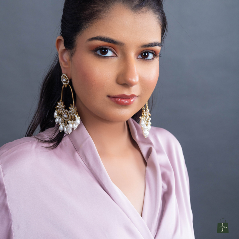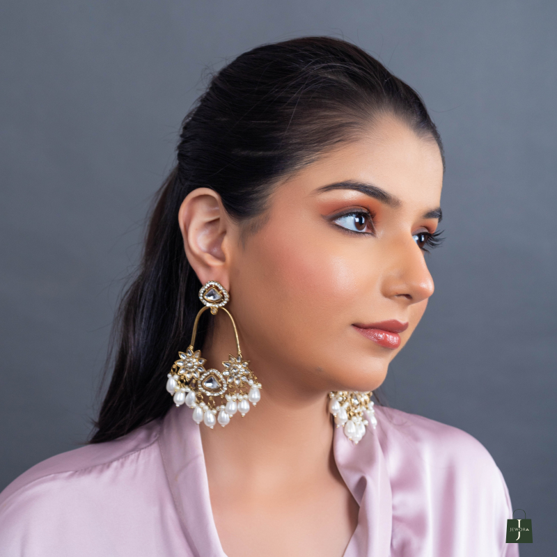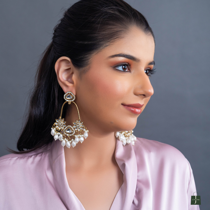 Step into the world of royal elegance with the Amaira Kundan Chandbali — a stunning blend of traditional artistry and modern sophistication. Designed with intricate floral motifs, these chandbalis feature radiant kundan stones, shimmering glass crystals, and elegant faux pearl drops that bring a timeless charm to every festive or wedding look.