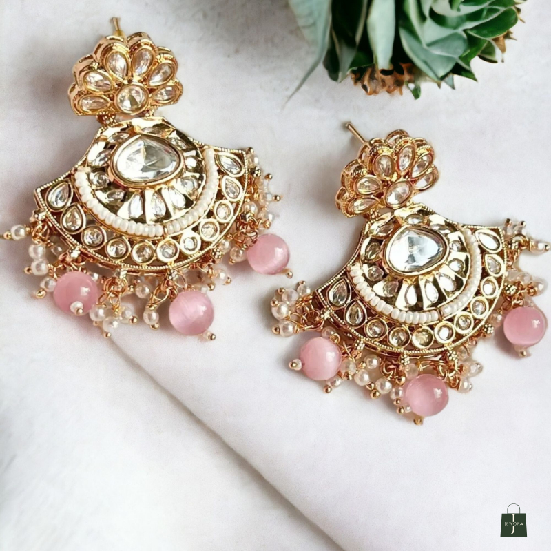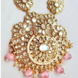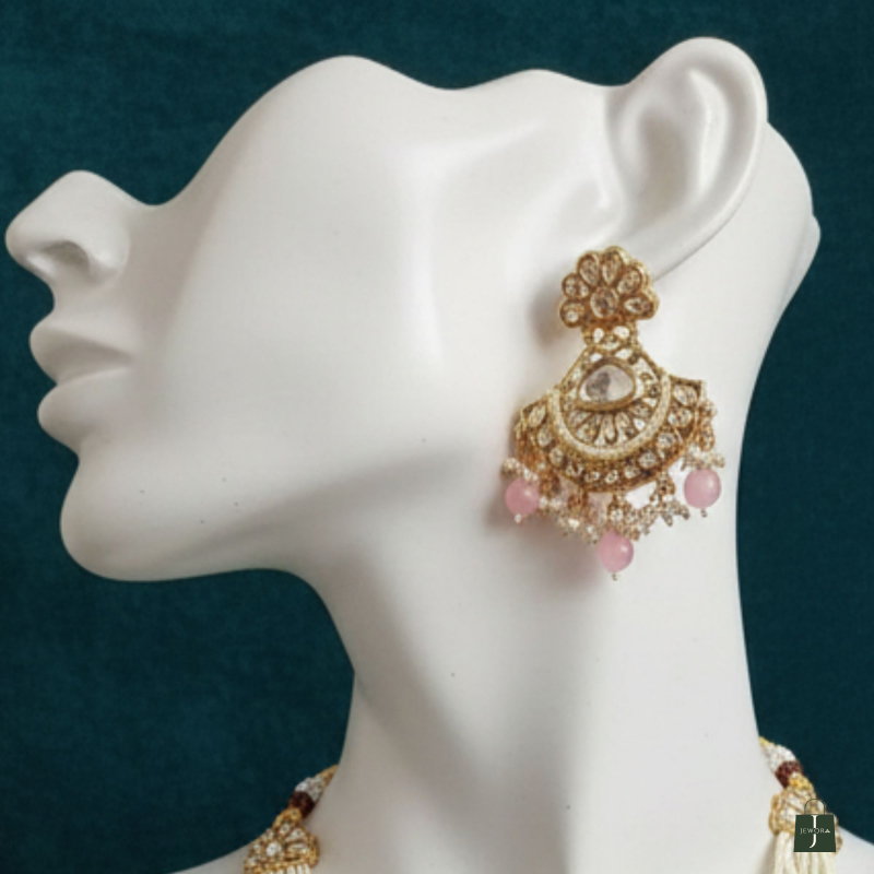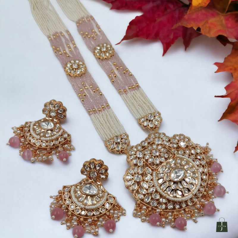 The AMARA BLUSH PEARL KUNDAN NECKLACE SET is a graceful blend of soft blush-toned pearls and intricately set diamond-style kundan stones, designed for timeless elegance. Featuring layered pearl strands, a richly detailed floral kundan pendant, and matching statement earrings with delicate pearl drops, this set exudes royal charm. Perfect for weddings, festive occasions, and elegant celebrations, it pairs beautifully with pastel sarees, lehengas, and contemporary ethnic wear, making it a refined yet striking addition to your jewellery collection.