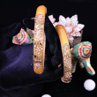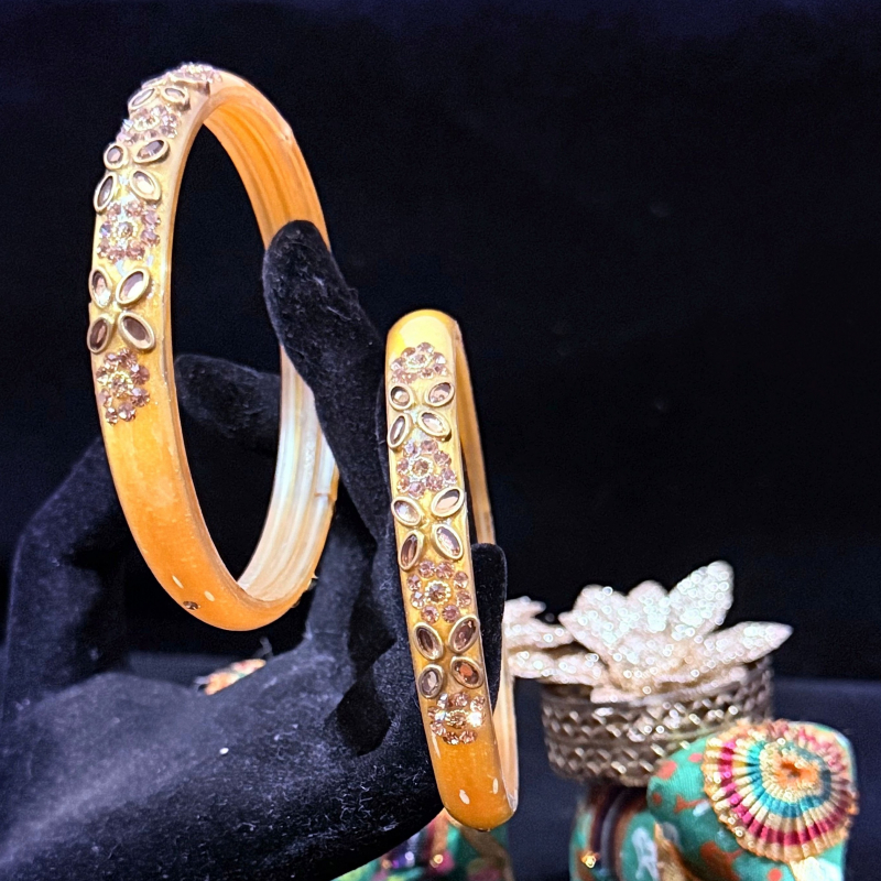 This beautiful pair of orange enamel bangles showcases intricate floral kundan detailing set in a rich gold polish. The glossy amber-orange base gives a warm, vibrant look, perfectly complemented by champagne-toned stones arranged in floral and oval patterns. Ideal for festive occasions, weddings, and traditional wear, these bangles bring a graceful and luxurious charm to any outfit.