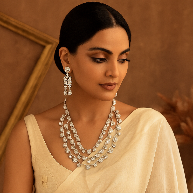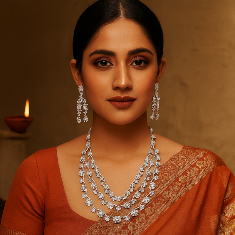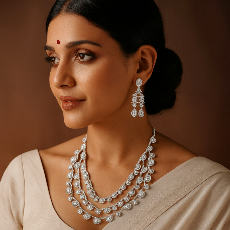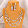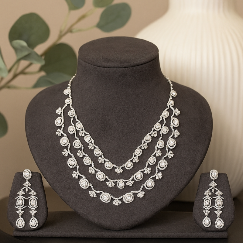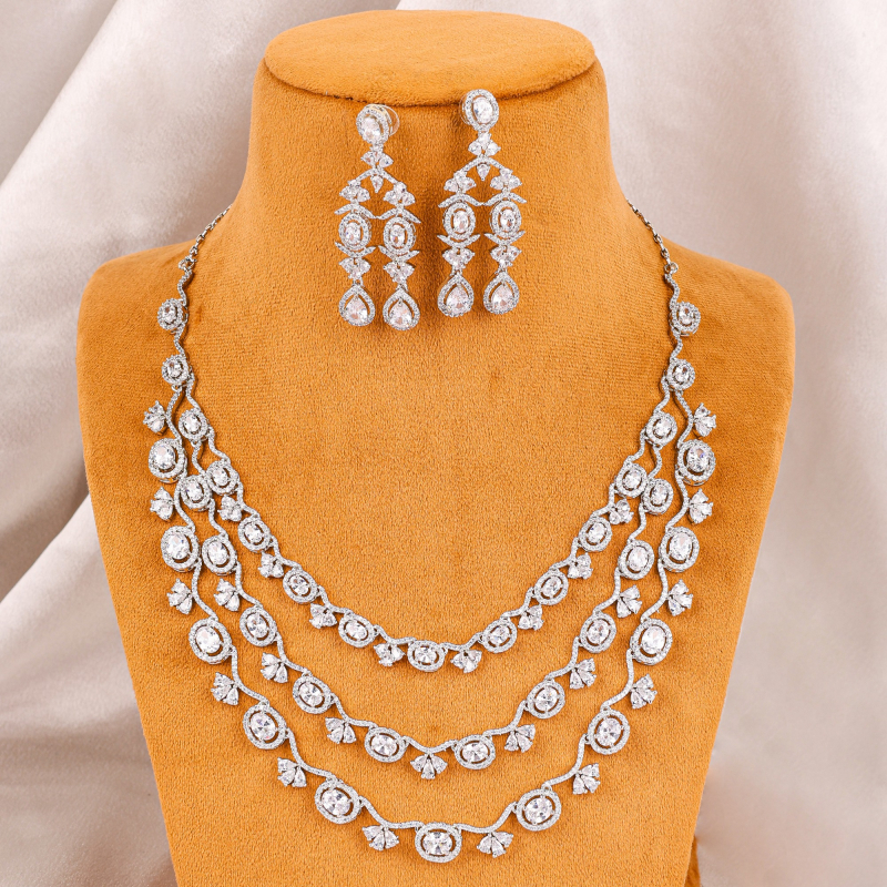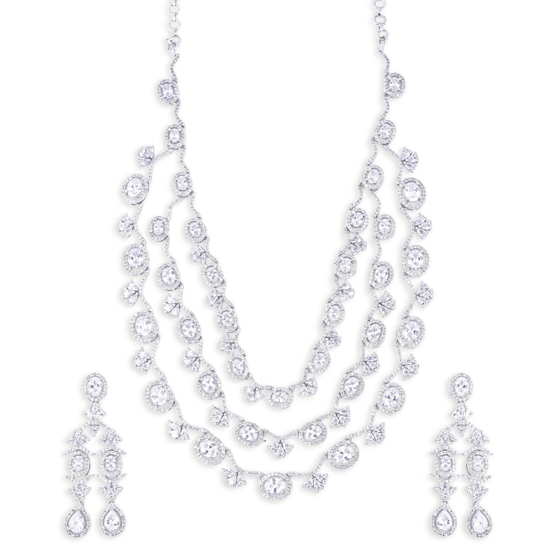 This American diamond rhodium plated multi layer luxurious shine necklace set made with exquisite craftsmanship paired with matching earrings, This design adds a touch of elegance to any outfit