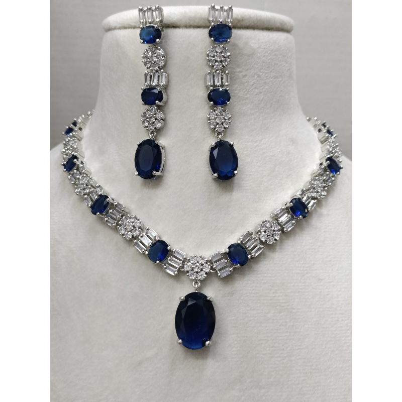 Elevate your elegance with our American Diamond Royal Blue Oval Shape Necklace Set. This stunning jewelry piece features a captivating royal blue oval pendant, surrounded by sparkling American diamonds that catch the light beautifully. Perfect for special occasions or adding a touch of glamour to everyday wear, this necklace set is designed to make you shine. Complete the look with matching earrings that enhance your style effortlessly.