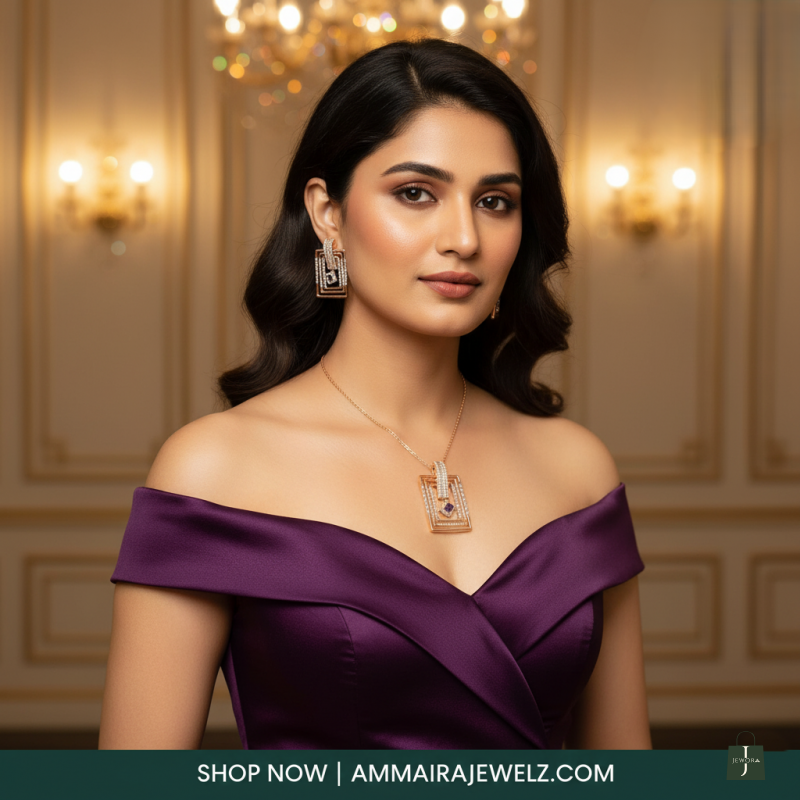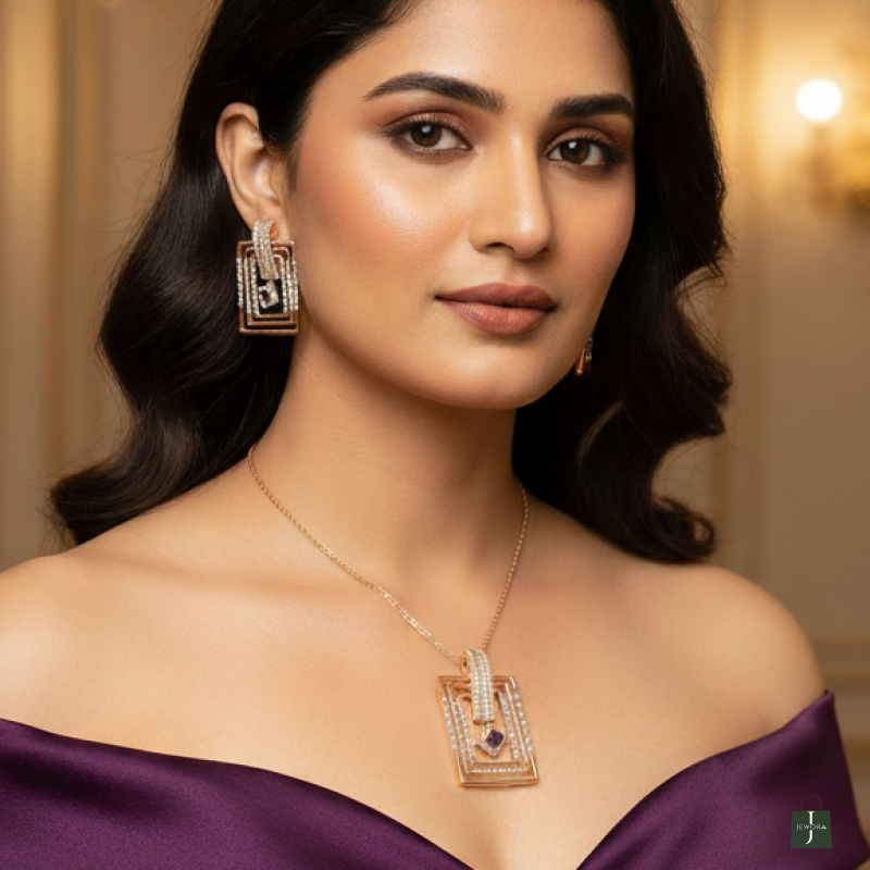 Add a touch of royal elegance to your wardrobe with this captivating geometric pendant and earring set. Crafted in a lustrous rose gold finish, the design features nested rectangular frames adorned with shimmering American Diamonds. The centerpiece is a striking amethyst-colored rectangular stone that provides a bold pop of color, making this set the perfect accessory for cocktail parties and evening gowns.