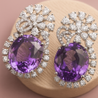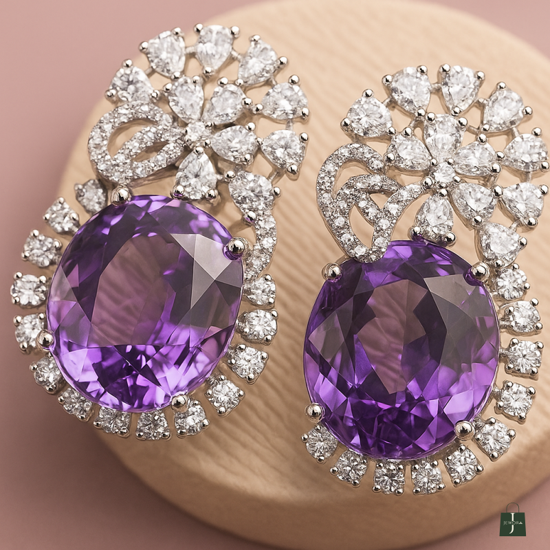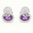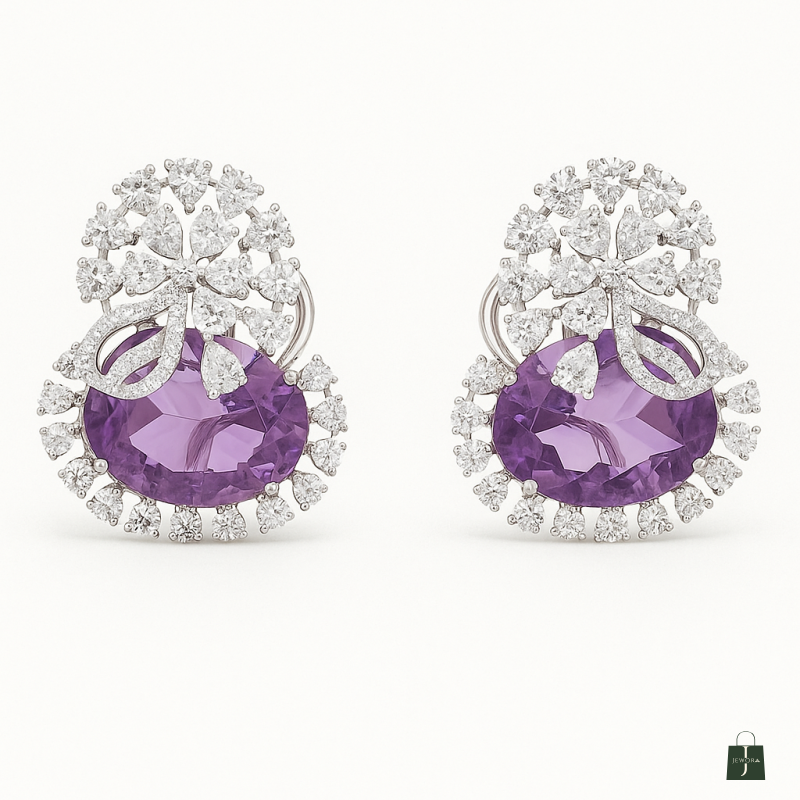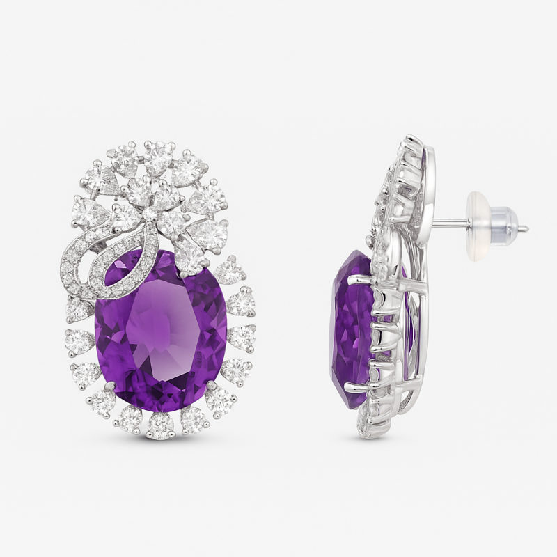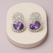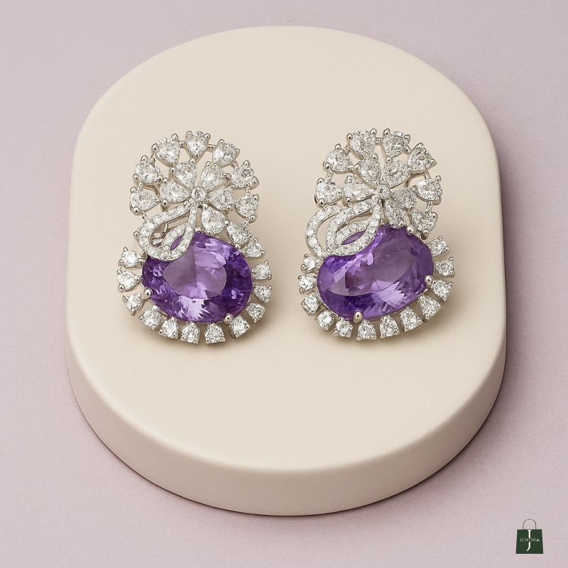 Indulge in elegance with these **Amethyst Sparkle Diamond Stud Earrings**, crafted to bring a touch of sophistication to your look. The earrings feature a brilliant combination of **oval-cut purple amethyst stones**, surrounded by dazzling American Diamond (CZ) embellishments arranged in a radiant floral pattern. The intricate craftsmanship enhances the sparkle, making them a statement piece for both festive occasions and formal events. Designed with a comfortable stud fastening, these earrings are perfect for long wear without compromising on luxury. Their unique purple hue paired with shimmering diamonds makes them an exquisite gift choice or a timeless addition to your personal collection.