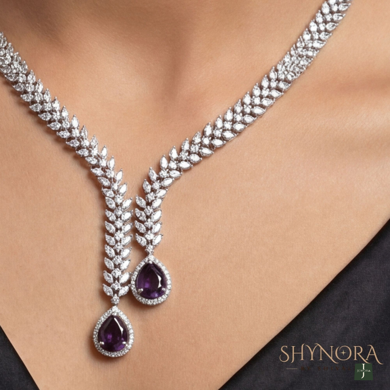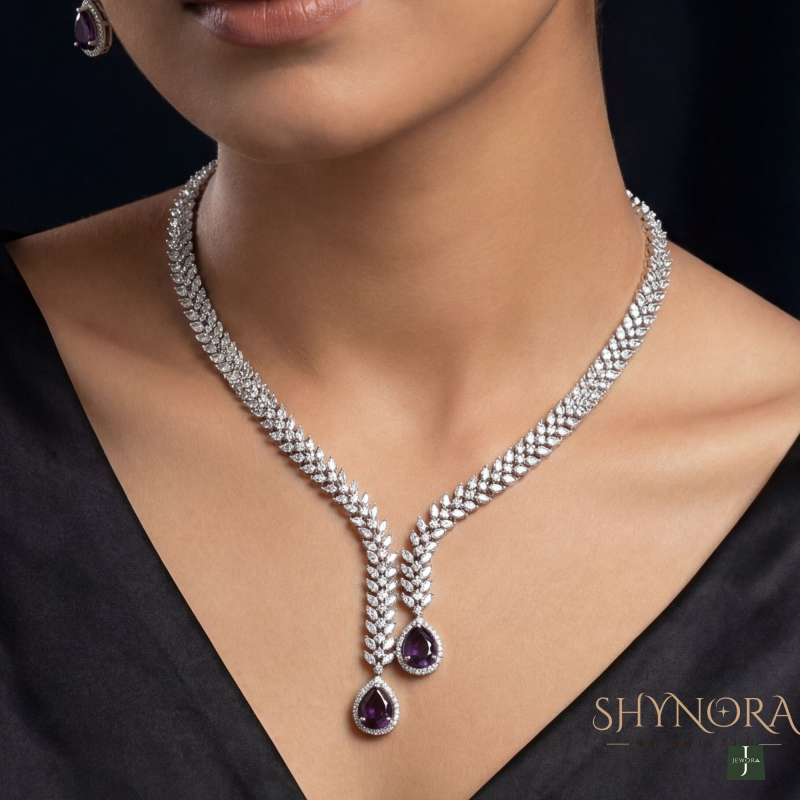 The Amethyst Twin-Drop Elegance Necklace Set is a graceful fusion of sparkle and sophistication. Designed with a sleek leaf-pattern crystal chain, the necklace flows into two delicate teardrop pendants set with deep purple stones, creating a refined cascading effect. The matching earrings mirror the same elegant drop design, making this set perfect for understated luxury.