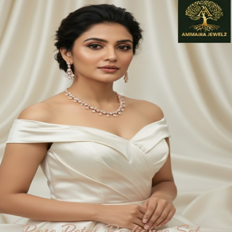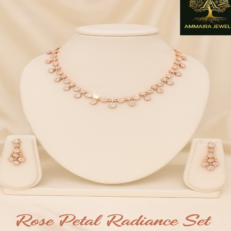 Glow with the delicate sparkle of this stunning rose-gold-tone necklace set. The necklace features a beautiful arrangement of shimmering CZ Diamond clusters, reminiscent of blooming petals, that drape gracefully along the collarbone. Each cluster is designed to catch the light, creating a continuous, radiant shimmer. The set is completed with matching drop earrings, echoing the petal motif for a perfectly coordinated and elegant look. This set from Ammaira Jewelz is the essence of feminine charm and sophistication.