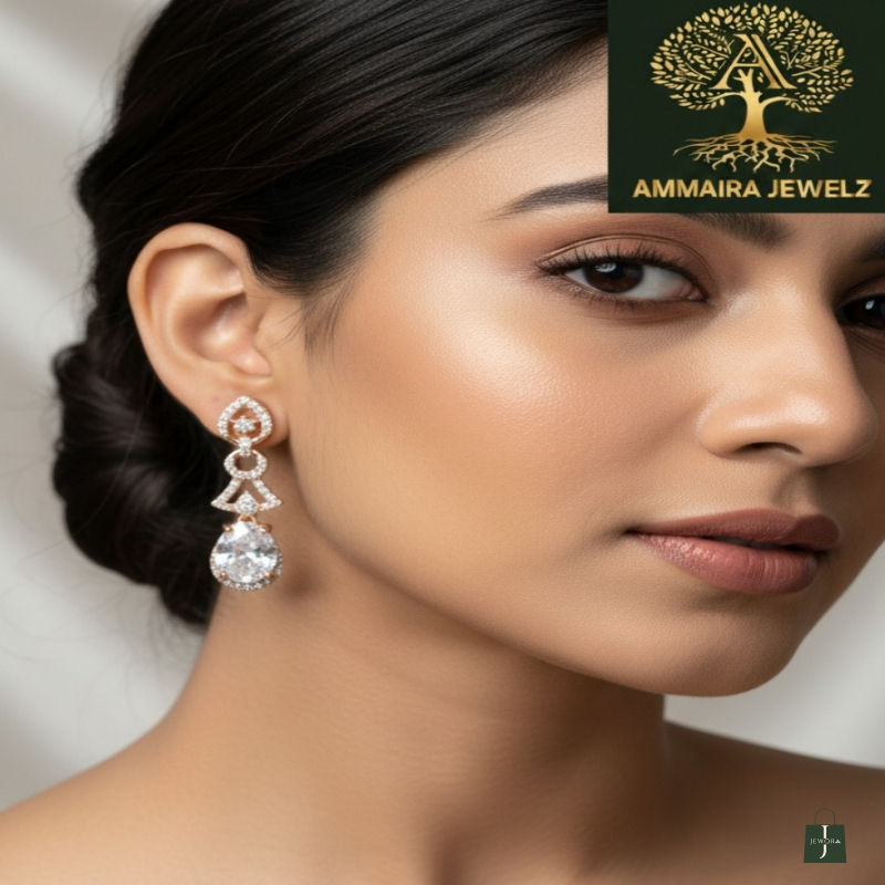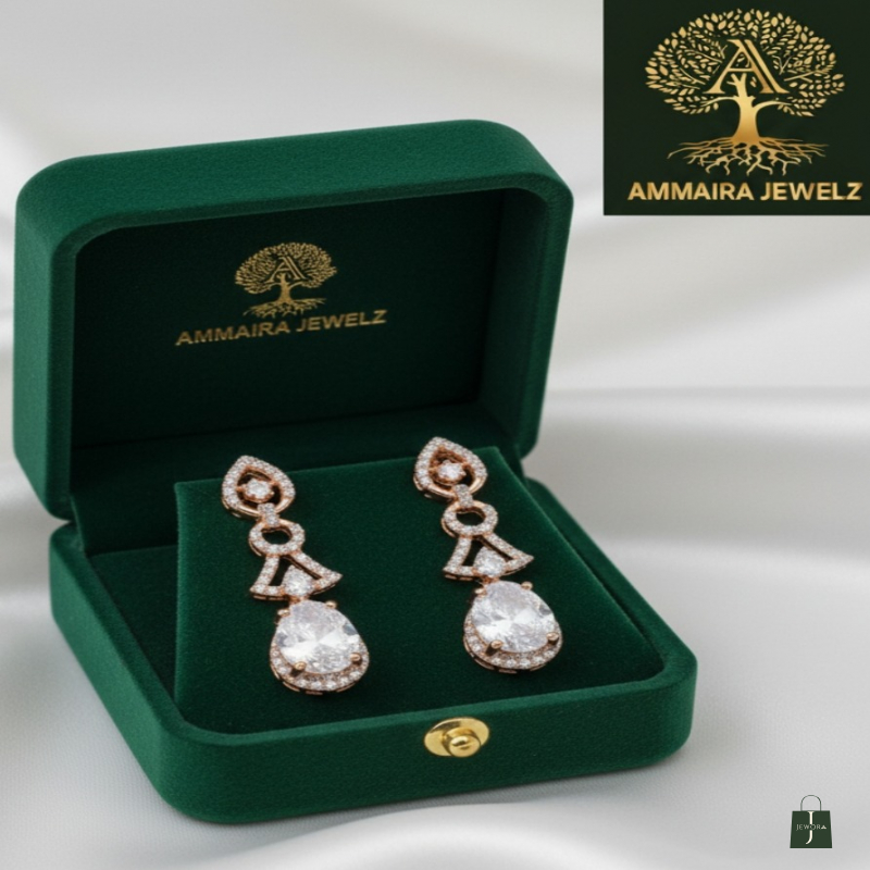 Make a vibrant statement with these dazzling rose-gold-tone earrings. The design features an elegant drop composed of intricate, openwork crystal-pavé shapes that glitter with every turn. This sparkling cascade leads to a stunning, oversized pear-cut, diamond-clear stone that catches every ray of light. These Ammaira Jewelz earrings are the perfect way to add a pop of luxurious, sophisticated glamour to your evening attire.