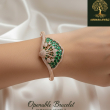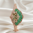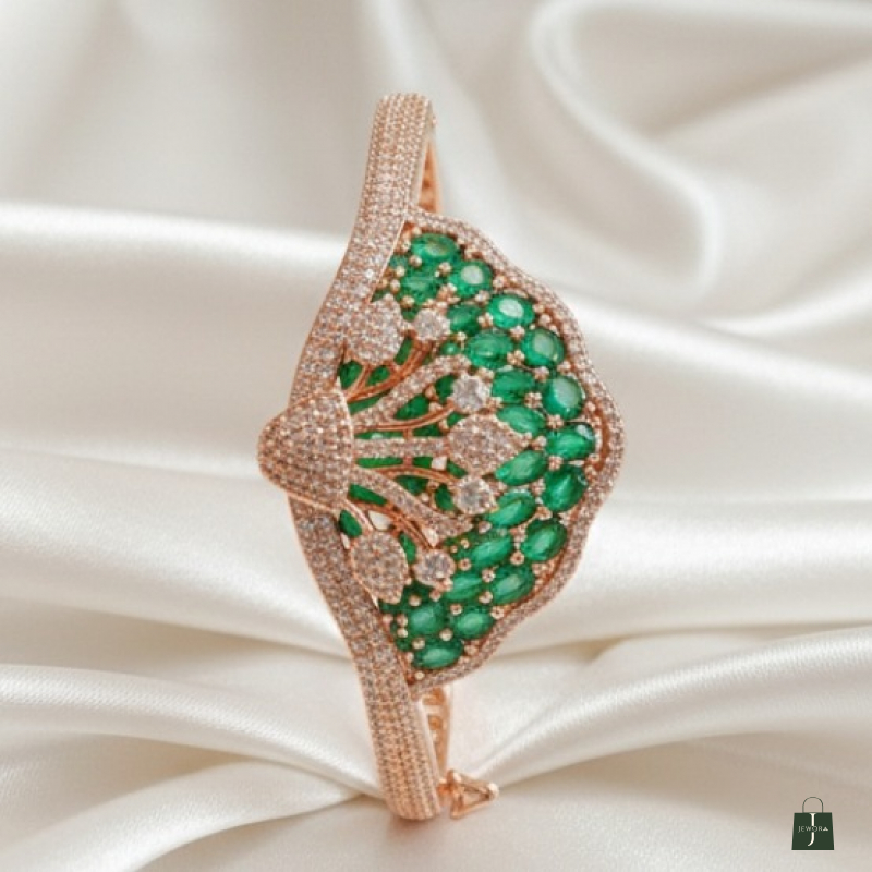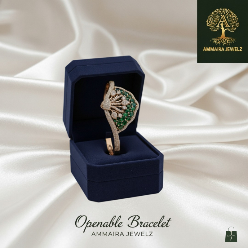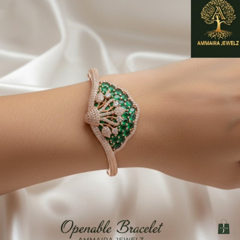 Make an unforgettable entrance with this breathtaking statement bracelet. Inspired by the majestic fan of a peacock, this piece features a stunning cluster of rich, emerald-green marquise stones. Intricate, crystal-pavé swirls sweep across the design, all set in a warm, polished rose-gold-tone. This "openable bracelet" from Ammaira Jewelz combines luxurious, eye-catching style with effortless wear.