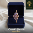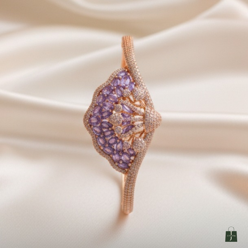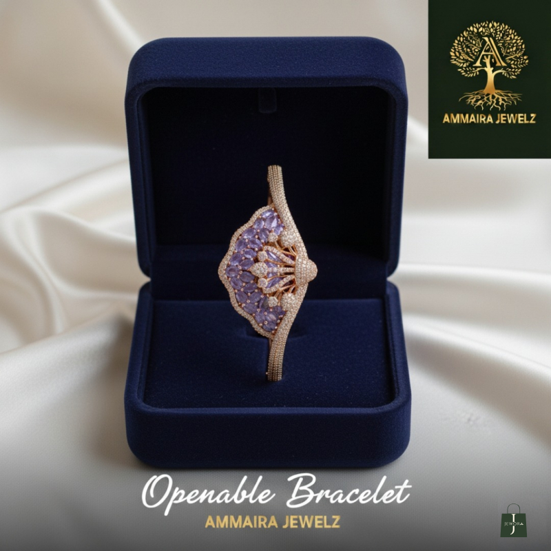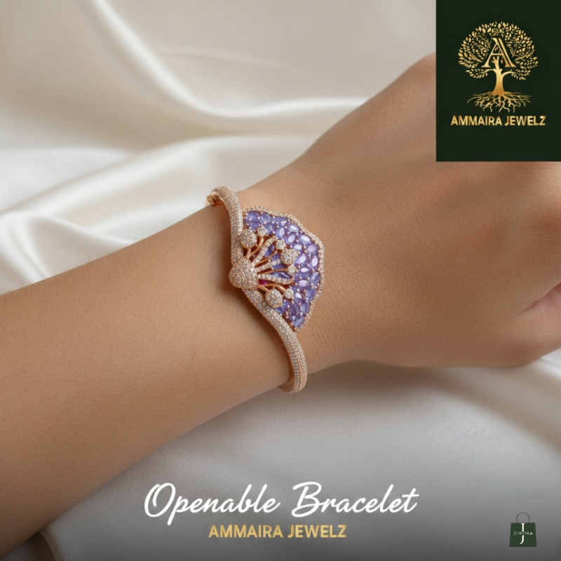 Make an unforgettable entrance with this breathtaking statement bracelet. Inspired by the elegant fan shape, this piece features a stunning cluster of soft, lavender-purple marquise stones. Intricate, crystal-pavé swirls sweep across the design, all set in a warm, polished rose-gold-tone. This "openable bracelet" from Ammaira Jewelz combines luxurious, eye-catching style with effortless wear.