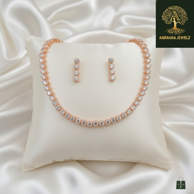 Embrace timeless romance with this radiant rose-gold-tone necklace set. This exquisite piece features a continuous strand of brilliant, round clear stones, each nestled in a delicate "rose petal" halo of sparkling crystals. The matching drop earrings echo the same floral-inspired design, creating a look of pure, sophisticated sparkle. This Ammaira Jewelz set is an elegant choice, perfect for a bride, bridesmaid, or any formal event.
