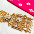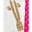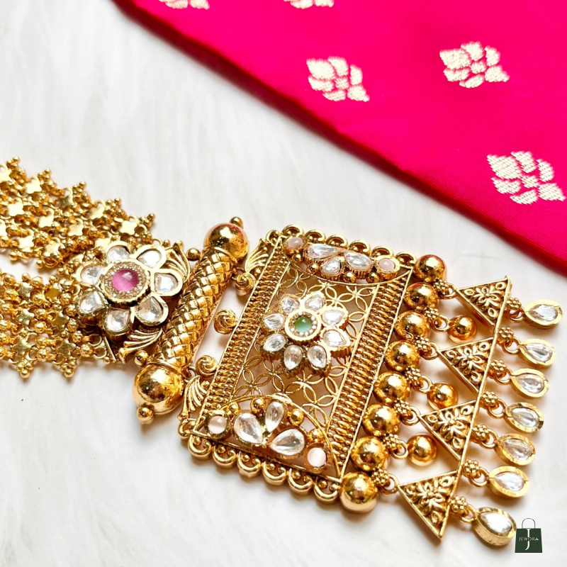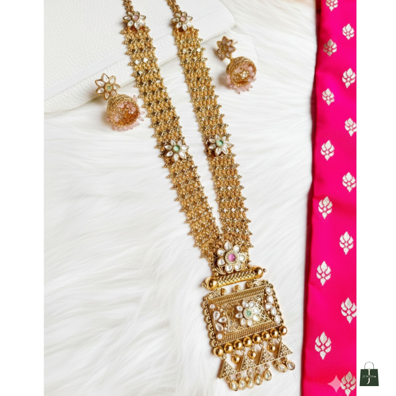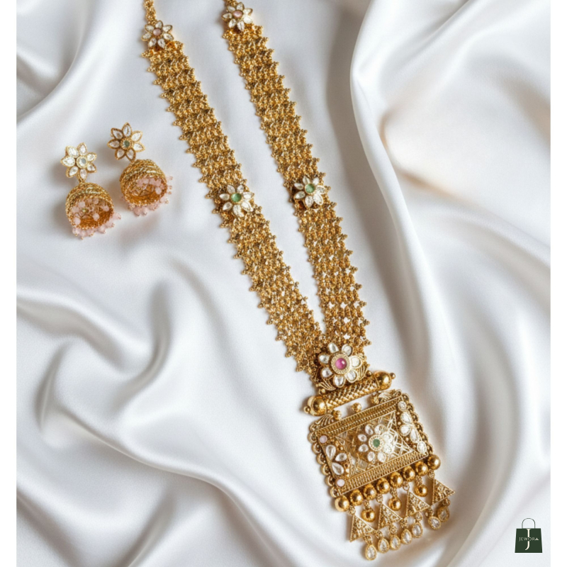 Add effortless elegance to your ethnic wardrobe with the ANANYA FLORAL KUNDAN LONG NECKLACE SET. Designed with intricate floral kundan motifs, this long necklace features a richly textured gold-tone chain paired with a beautifully structured square pendant. Subtle pastel stone accents enhance the handcrafted look, while the dangling bead details add graceful movement.