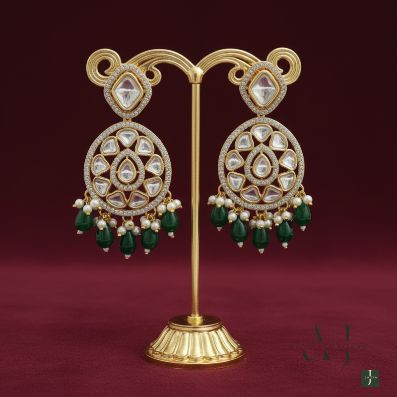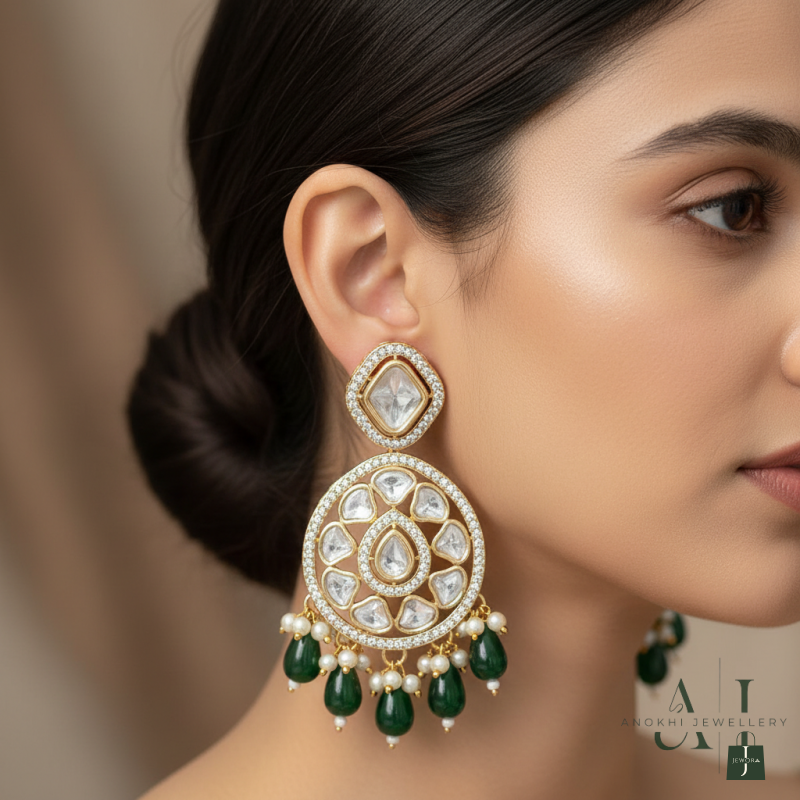 Anokhi Chandabali Kundan Earrings showcase traditional craftsmanship with a contemporary edge. These statement pieces feature intricate kundan work set in a classic chandabali silhouette, complemented by gracefully suspended pearl beads that catch light with every movement. The combination of polished gemstones and lustrous pearls creates a sophisticated interplay of texture and shine, making these earrings equally suited for festive occasions and elevated everyday wear. Handcrafted with attention to detail, they embody the timeless elegance of Indian jewelry heritage.