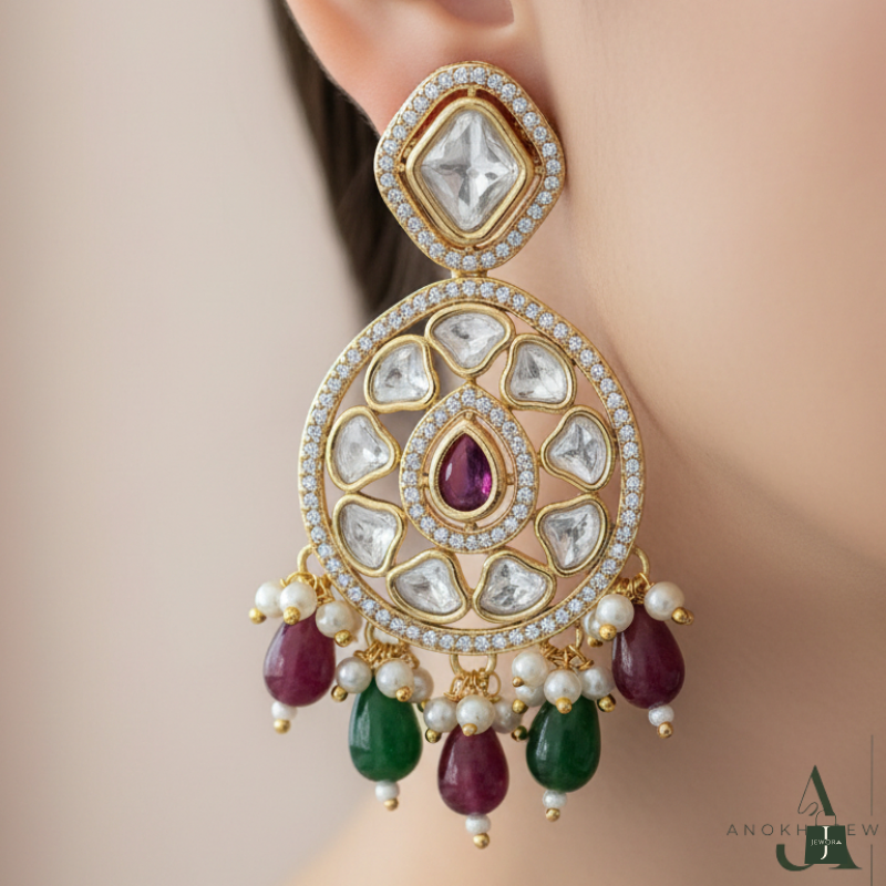 Anokhi Chandabali Kundan Earrings showcase traditional craftsmanship with a contemporary edge. These statement pieces feature intricate kundan work set in a classic chandabali silhouette, complemented by gracefully suspended pearl beads that catch light with every movement. The combination of polished gemstones and lustrous pearls creates a sophisticated interplay of texture and shine, making these earrings equally suited for festive occasions and elevated everyday wear. Handcrafted with attention to detail, they embody the timeless elegance of Indian jewelry heritage.