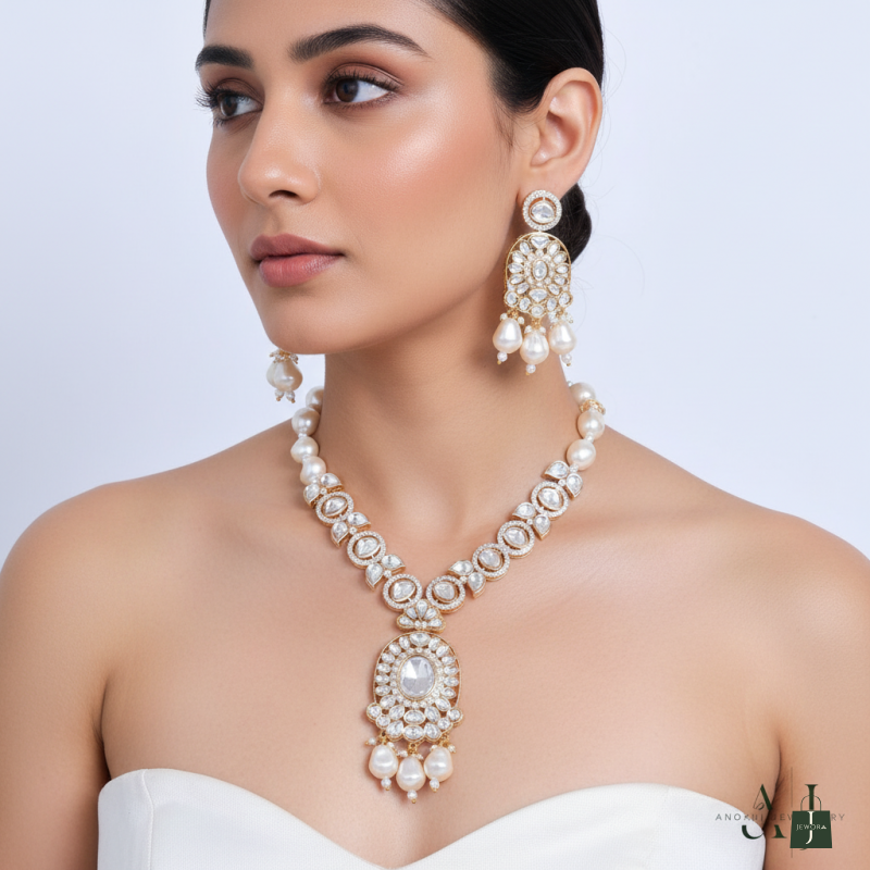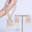 Indulge in regal sophistication with our Kundan Pearl Long Jewelry Set. This exquisite ensemble features intricately set Kundan stones, exuding timeless charm. The elongated design, adorned with lustrous pearls, adds a touch of elegance, making it a perfect accessory for special occasions.