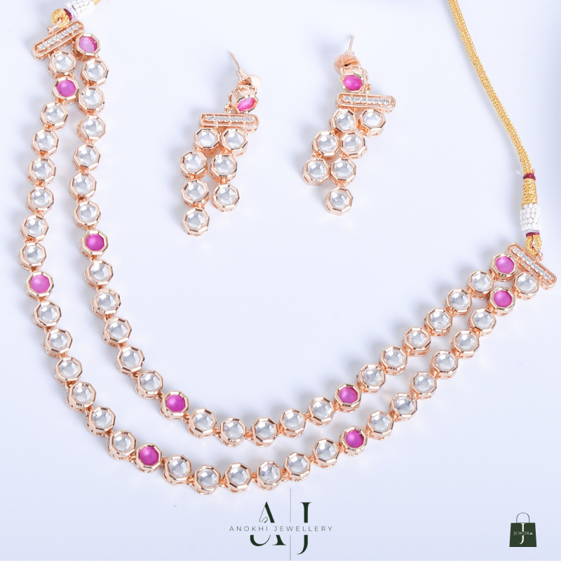 Unveil the perfect blend of tradition and elegance with the Preeti Kundan Necklace, a stunning creation that promises to elevate your jewelry collection. Featuring exquisite Kundan craftsmanship, this necklace is adorned with a harmonious mix of radiant clear stones and vibrant pink accents, making it a versatile choice for both festive occasions and intimate gatherings.