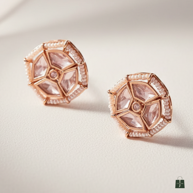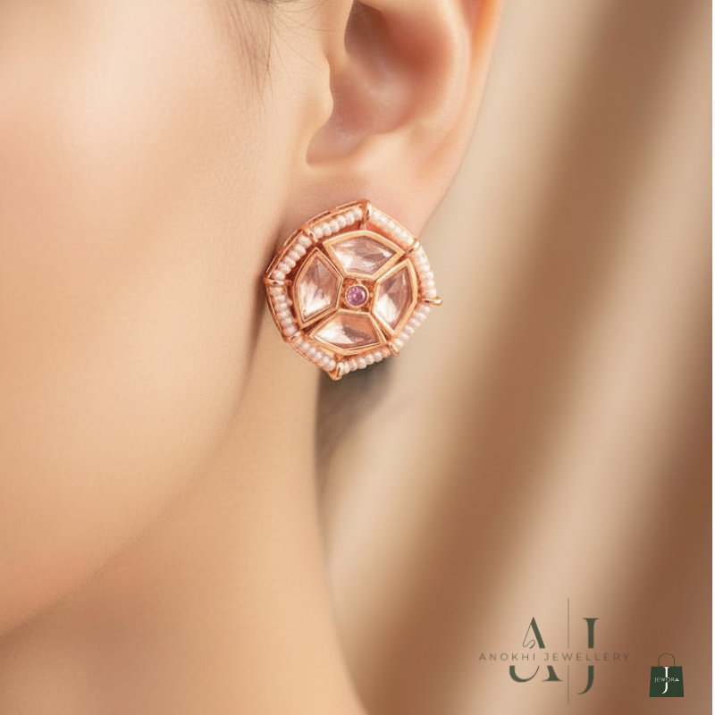 Elevate your everyday elegance with these exquisite kundan pearl studs, where traditional craftsmanship meets contemporary design. Each piece features lustrous pearls set within intricately detailed kundan work, showcasing the finest artisanal techniques. The perfect balance of sophistication and subtlety, these studs complement both casual and formal occasions. Lightweight and comfortable for all-day wear, they're an investment in timeless jewelry that transcends seasonal trends. A signature addition to any discerning jewelry collection.