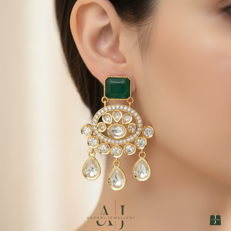 Anokhi Kundan Statement Chandabali Drops showcase traditional craftsmanship with a contemporary edge. These chandabali earrings feature intricate kundan work anchored by a striking centre stone that commands attention. The meticulous stone-setting technique creates depth and luminosity, while the chandabali silhouette offers graceful movement. Ideal for festive occasions, weddings, or anyone seeking heirloom-quality pieces that blend heritage artistry with modern elegance.