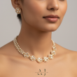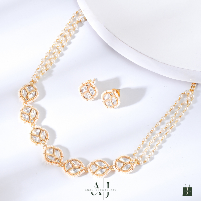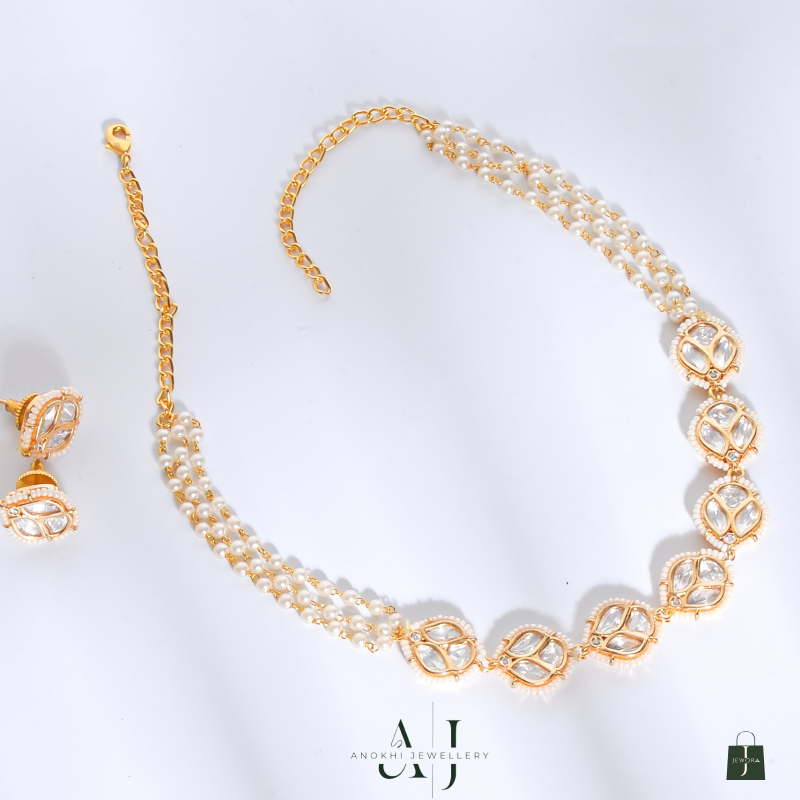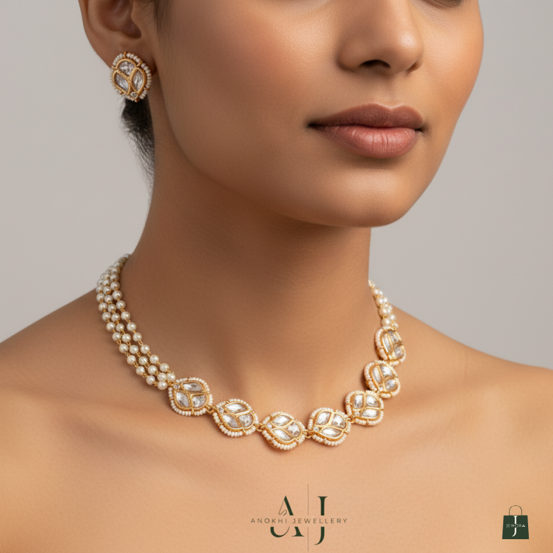 Redefine sophistication with this meticulously designed masterpiece that effortlessly combines artistry and glamour. This captivating set seamlessly blends opulence and craftsmanship, featuring radiant Kundan stones meticulously handcrafted and beaded with white pearls into a stunning necklace and matching earrings.Embrace your inner royalty with Anokhi's regal Kundan creations. Each piece is a symbol of timeless splendor, designed to adorn you with majestic allure. Elevate your style and reign with grace wherever you go. #RegalElegance #MajesticAdornments #AnokhiRoyalty