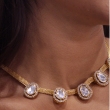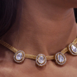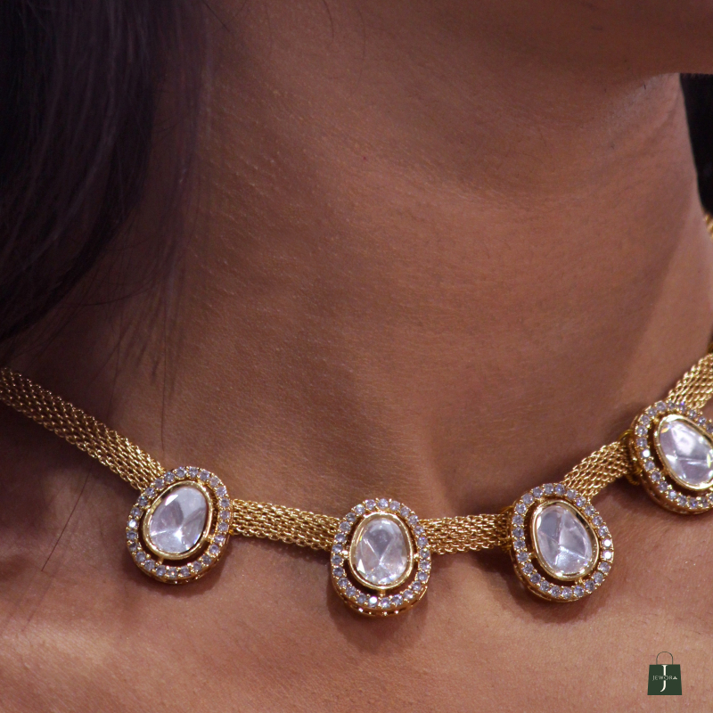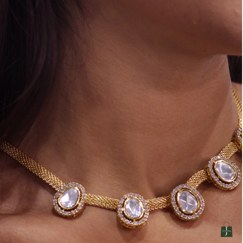 This Anokhi necklace features elegant kundan stones intricately placed on a metal mesh to create a stunning and unique oval necklace. Combining traditional design with modern materials, it adds a touch of sophistication to any outfit. A must-have for any jewelry collection.