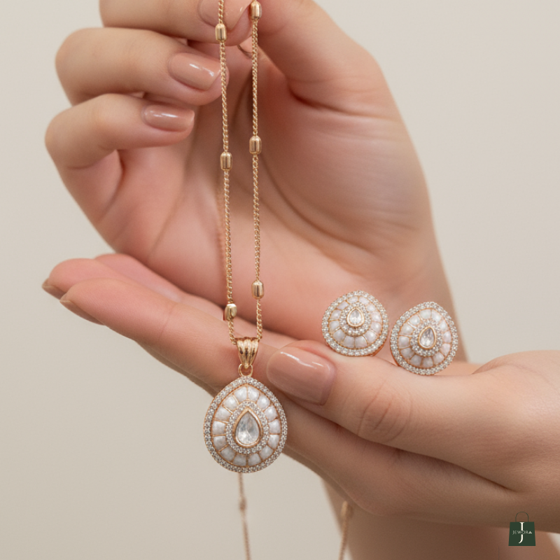 Elevate your jewellery collection with this exquisite pendant set, expertly crafted to showcase stunning stone work. The matching earrings feature complementary dazzling embellishments that create a cohesive, sophisticated look. Each piece is meticulously designed to catch light and draw admiration, making this set ideal for both special occasions and elevated everyday wear. The harmonious pairing ensures effortless styling while delivering the refined elegance that defines fine jewellery craftsmanship.