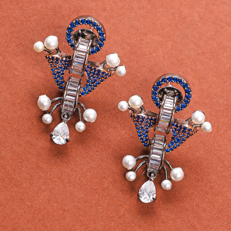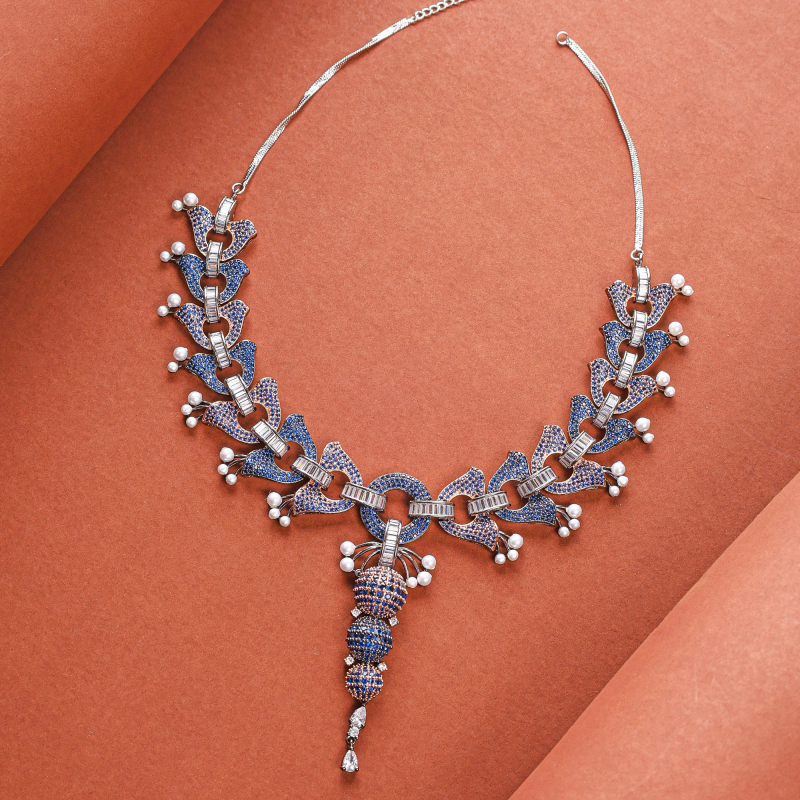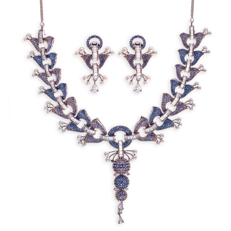 This gold plated blue cubic zirconia luxurious shine necklace set made with exquisite craftsmanship paired with matching earrings, This design is eye catching for festive occasions, wedding and evening wear.