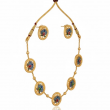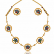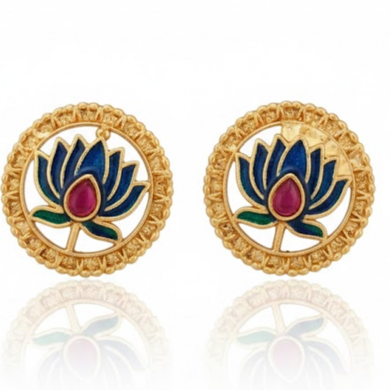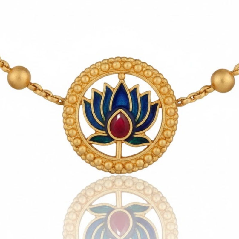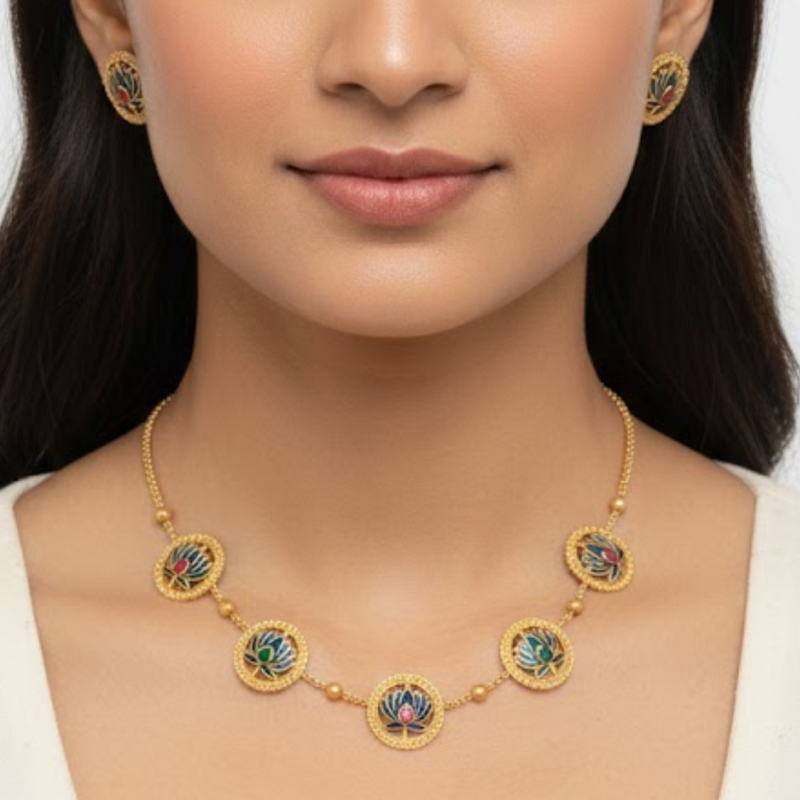A symbol of grace and purity, this handcrafted Lotus Design Necklace Set brings together traditional elegance and artistic craftsmanship. Each lotus motif is beautifully detailed with dark blue enamel petals surrounded by an antique gold border, exuding timeless charm. The adjustable golden dori enhances comfort while the matching earrings complete the look — perfect for festive occasions, weddings, or ethnic celebrations.