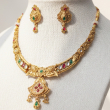 Define your festive style with the Royal Fan-Gala Choker, an exquisite showcase of antique artistry. This set features a magnificent, wide-flared fan-shaped pendant intricately engraved with floral motifs and vibrant ruby and emerald-colored stones. With its broad, textured band and matching statement earrings, this ensemble brings a majestic, high-coverage look to any grand celebration.